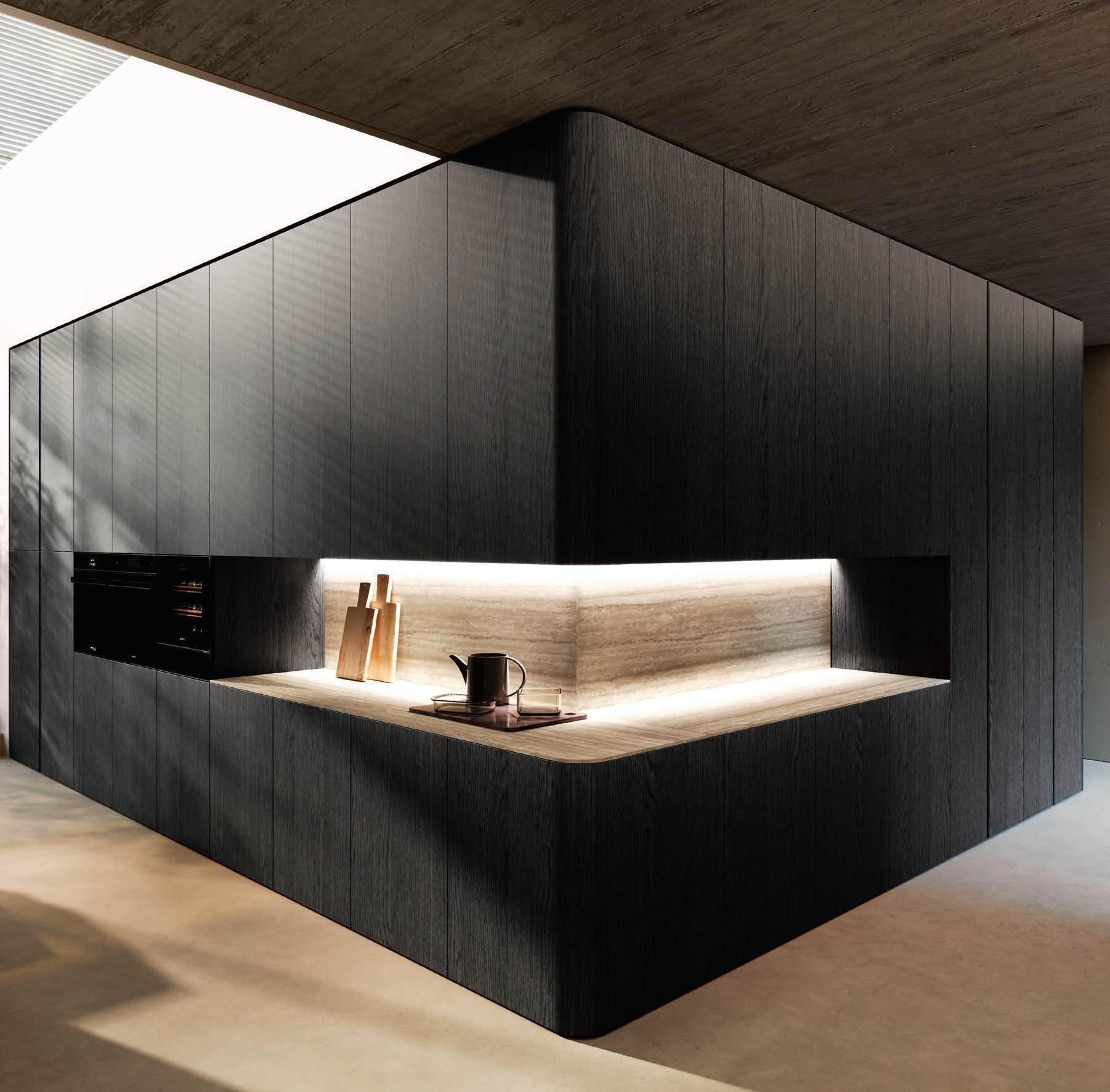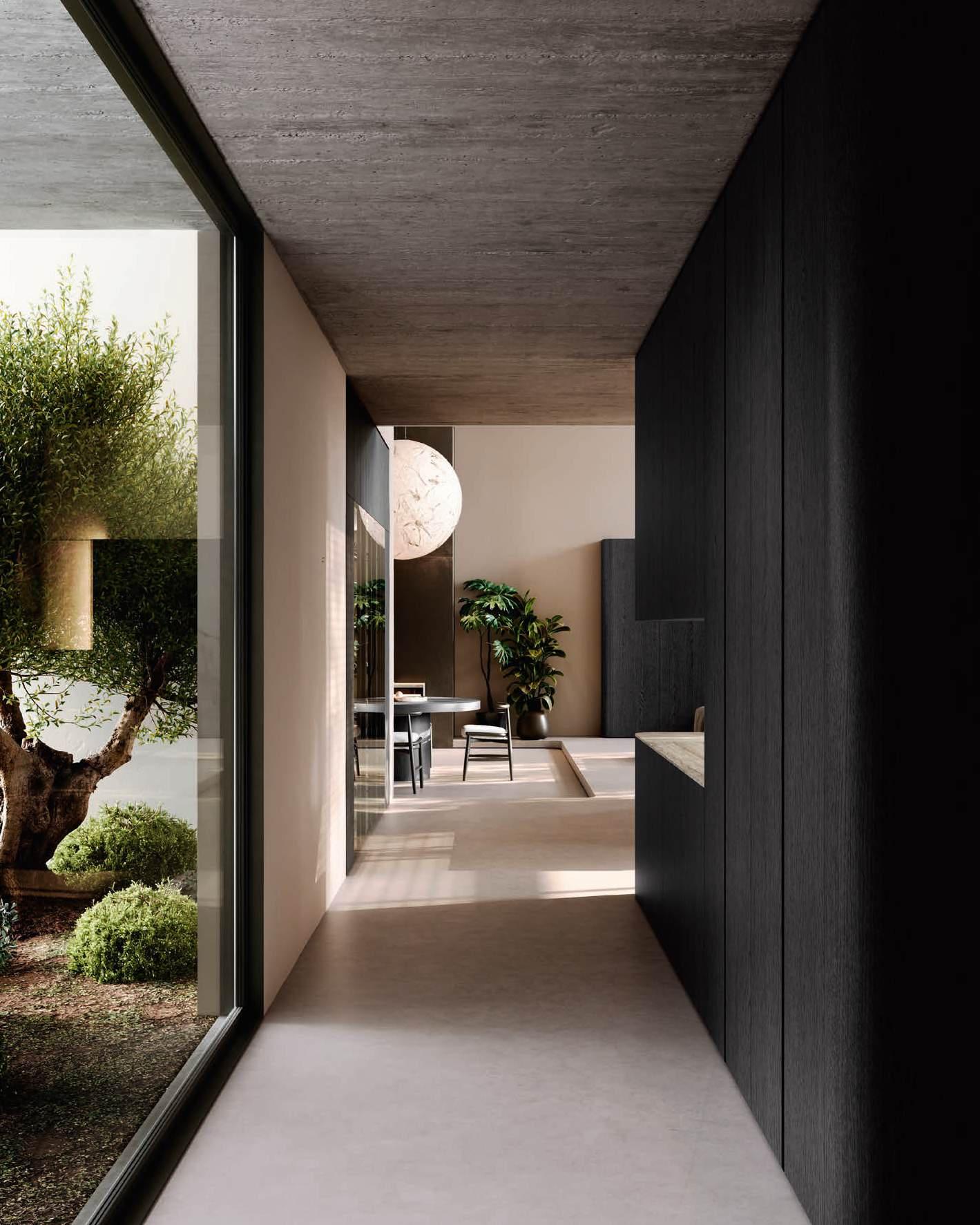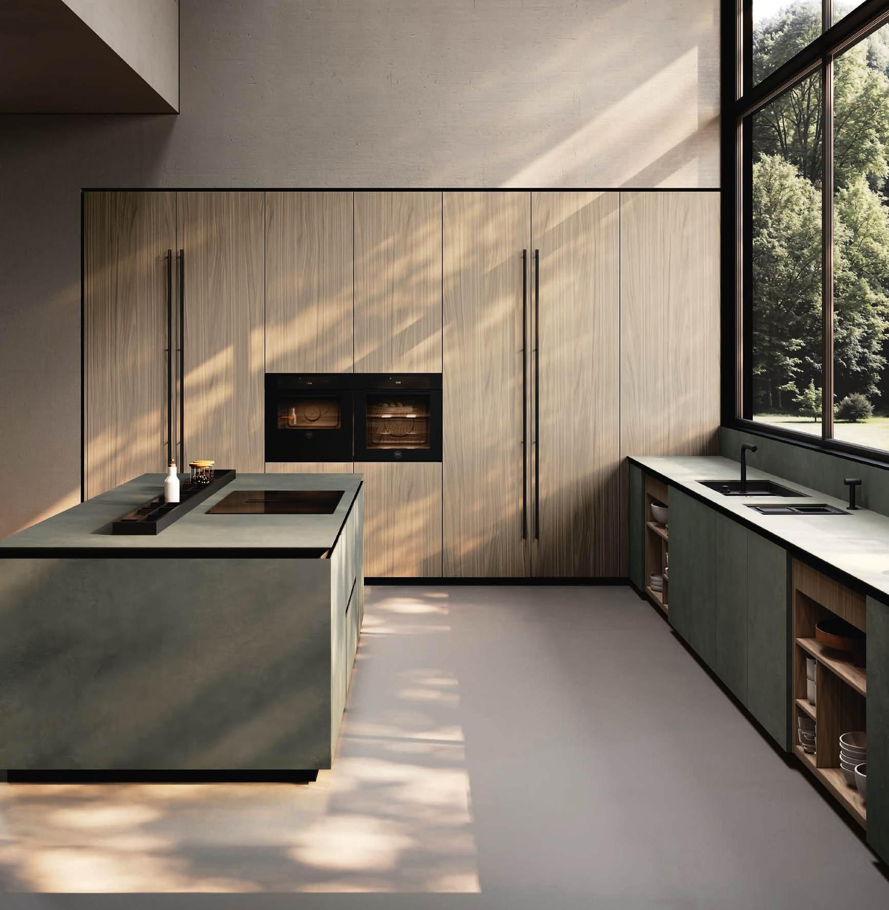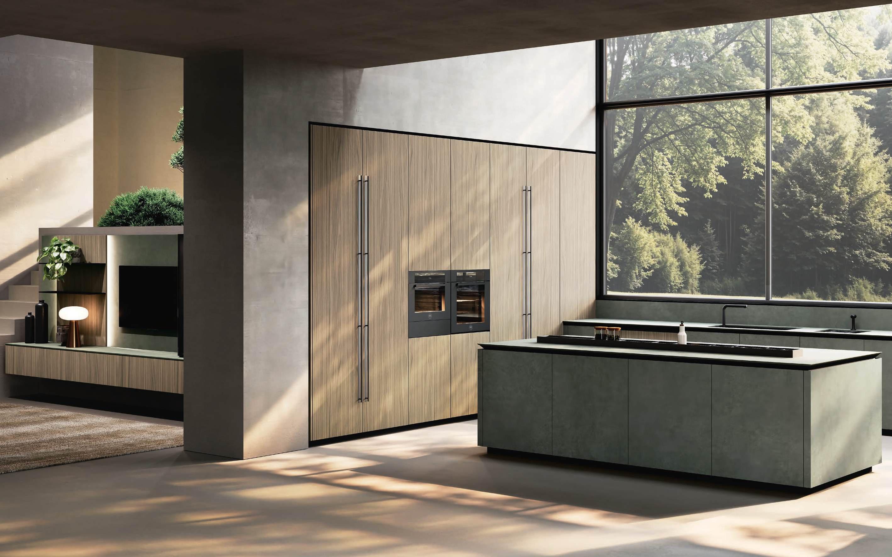 Una curvatura nuova e travolgente in bilaminato legno Rovere Black accompagna il visitatore dall’ingresso al vero nucleo della casa, le due isole con basamento Regula in alluminio nero opaco e ante Lab in grès Travertino Silver Bocciardato, tripudio di leggerezza grazie ai piedini che le sollevano da terra. La nuova vetrina Ebe è una nota leggera che si articola intorno a strutture in alluminio nero e schienali nella stessa finitura dell’area kitchen. E nel soggiorno, accanto alla madia con ante Petra, una parete living con boiserie dall’approccio bi - materico, declinato su tre differenti superfici, conferisce carattere e personalità agli spazi in un dialogo materico fra bilaminato legno Rovere Black e grès Travertino Silver Bocciardato.