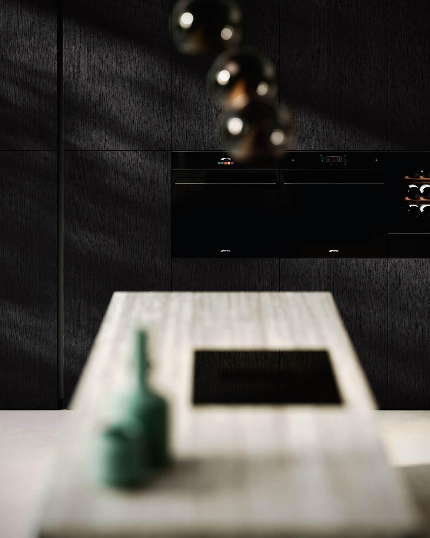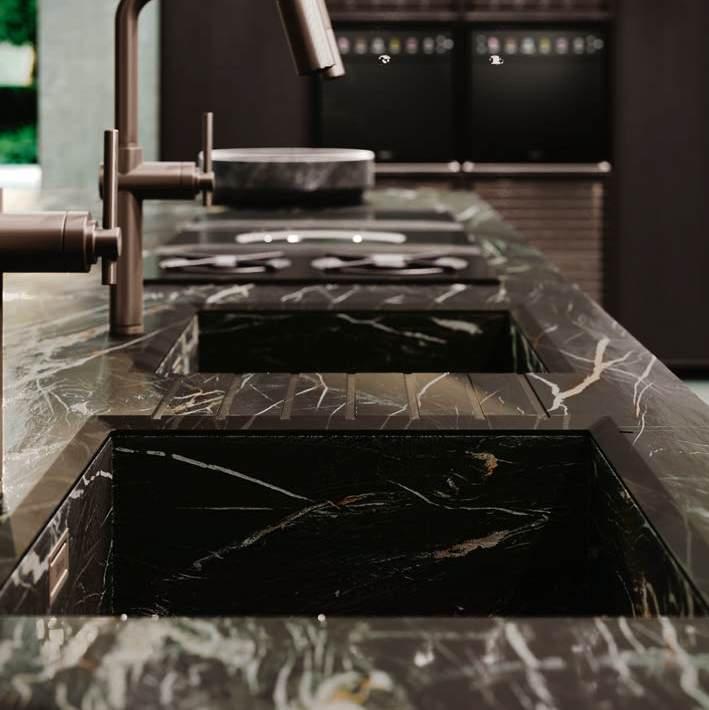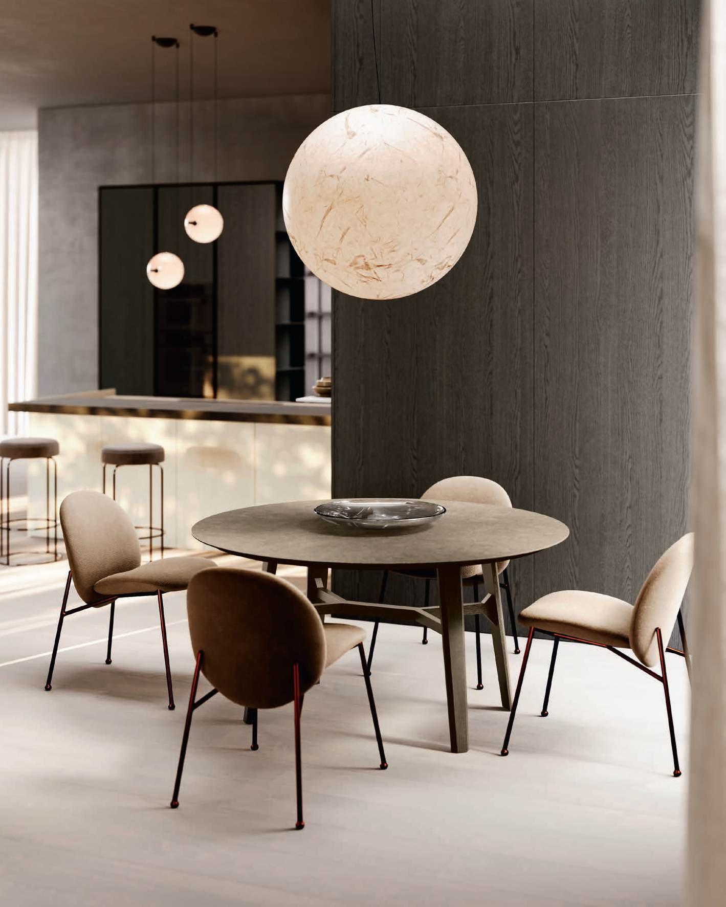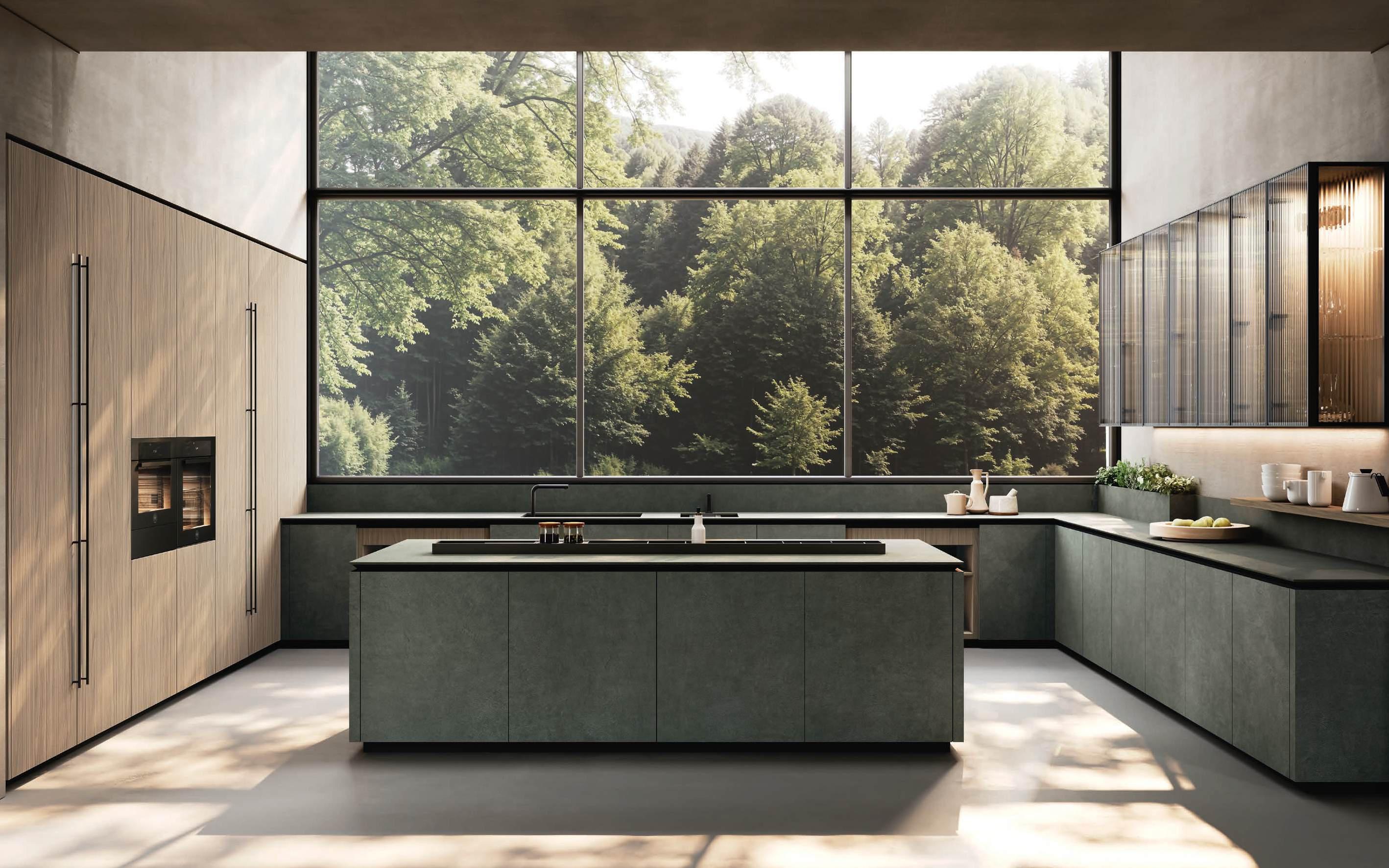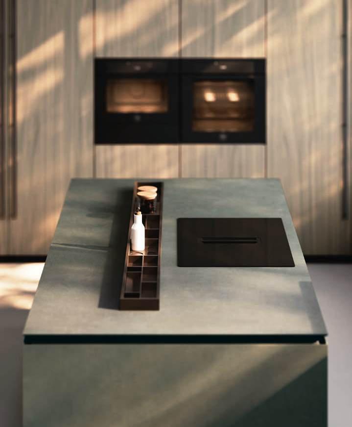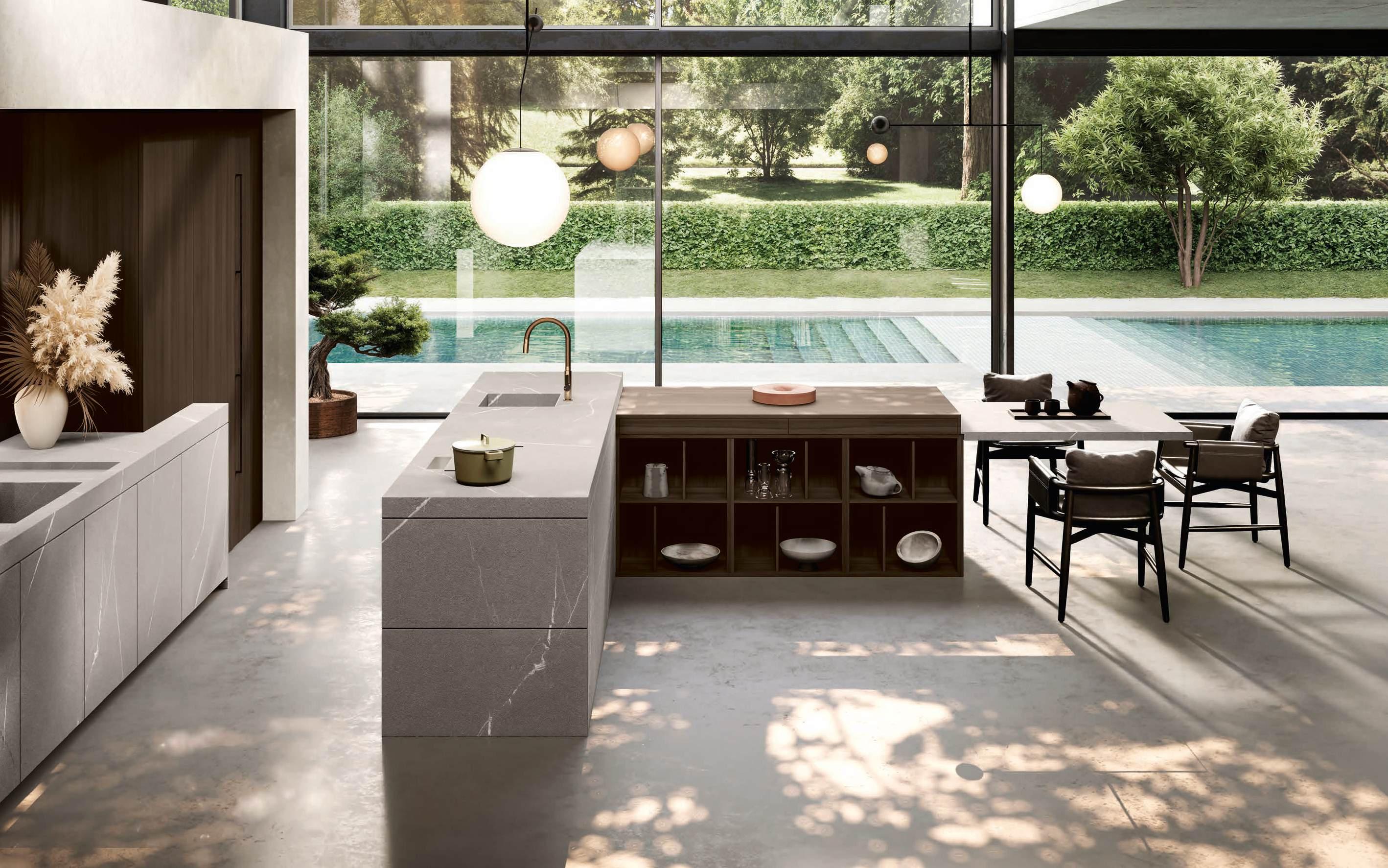 Una curvatura nuova e travolgente in bilaminato legno Rovere Black accompagna il visitatore dall’ingresso al vero nucleo della casa, le due isole con basamento Regula in alluminio nero opaco e ante Lab in grès Travertino Silver Bocciardato, tripudio di leggerezza grazie ai piedini che le sollevano da terra. La nuova vetrina Ebe è una nota leggera che si articola intorno a strutture in alluminio nero e schienali nella stessa finitura dell’area kitchen. E nel soggiorno, accanto alla madia con ante Petra, una parete living con boiserie dall’approccio bi - materico, declinato su tre differenti superfici, conferisce carattere e personalità agli spazi in un dialogo materico fra bilaminato legno Rovere Black e grès Travertino Silver Bocciardato.