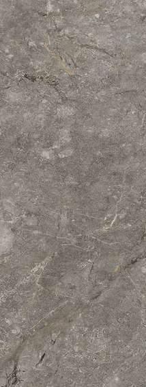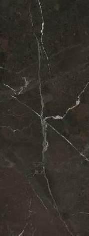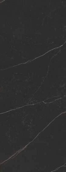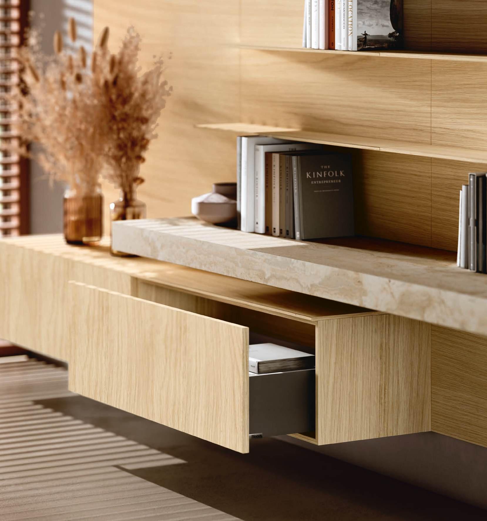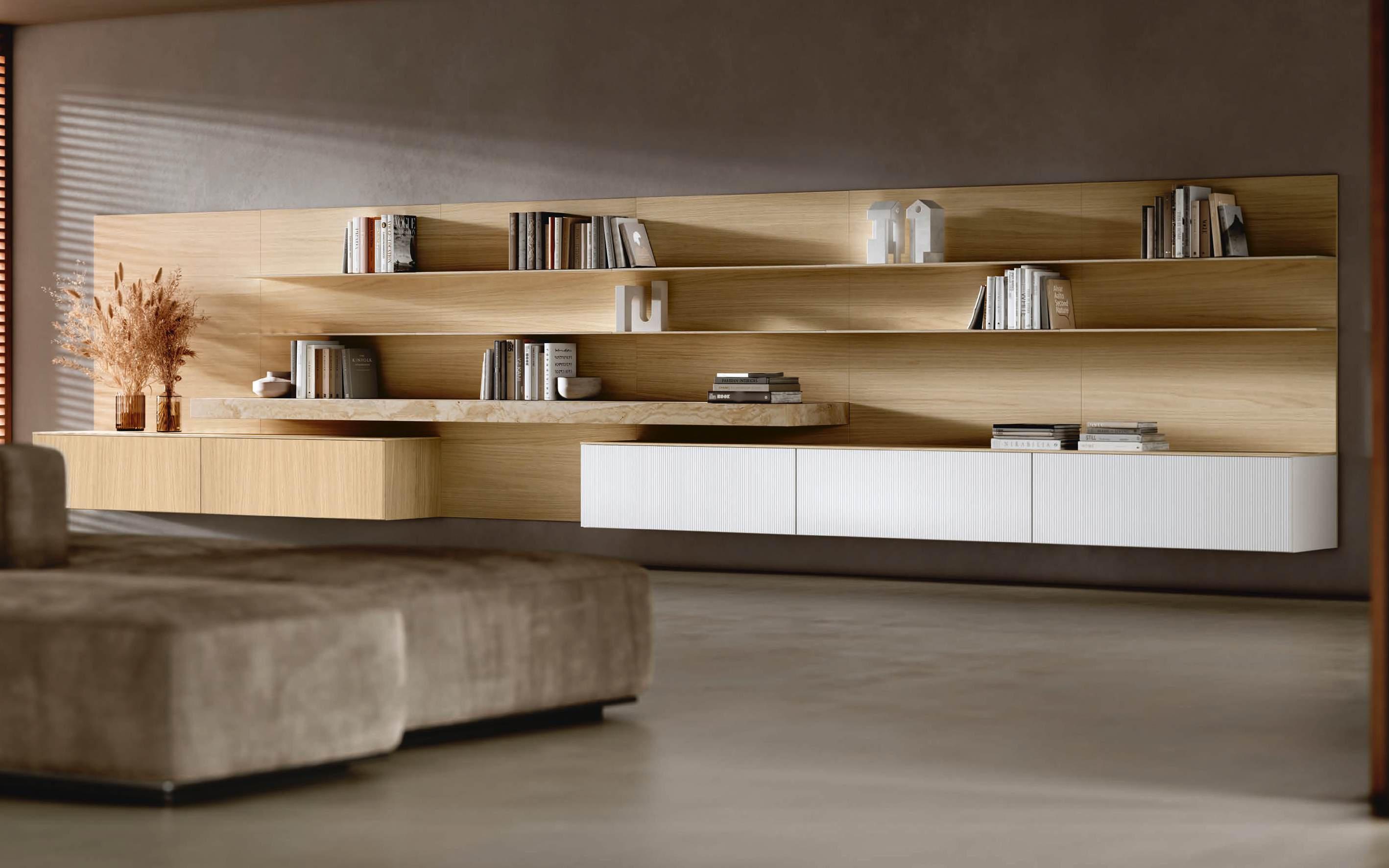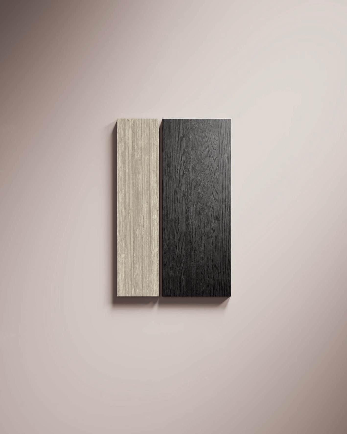 Living wall consisting on the left of columns in Bilaminate Legno Rovere Black with curved terminals, tris paneling in Bilaminate Legno Rovere Black and honed Travertino Silver Bocciardato stone. At the bottom, Lab base units with black aluminum frames and porcelain Travertino Silver Bocciardato doors, finishing with a Tray pocket module in Bilaminate Legno Rovere Black.