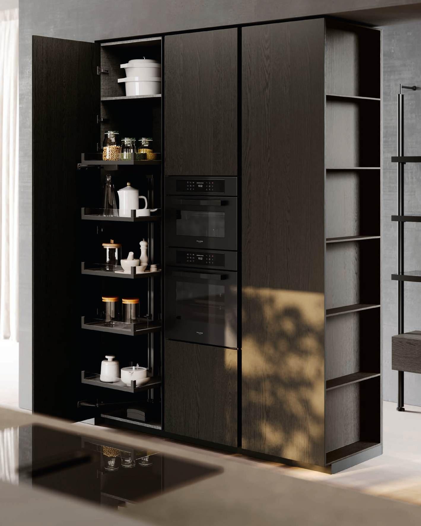 Dettaglio colonne forno con ante Zen in legno laccato poro aperto Nero Traffico e vetro fumè, struttura interna in finitura bilaminato legno Rovere Black. Colonne tecniche laterali con ante Hily in legno laccato poro aperto Nero Traffico.