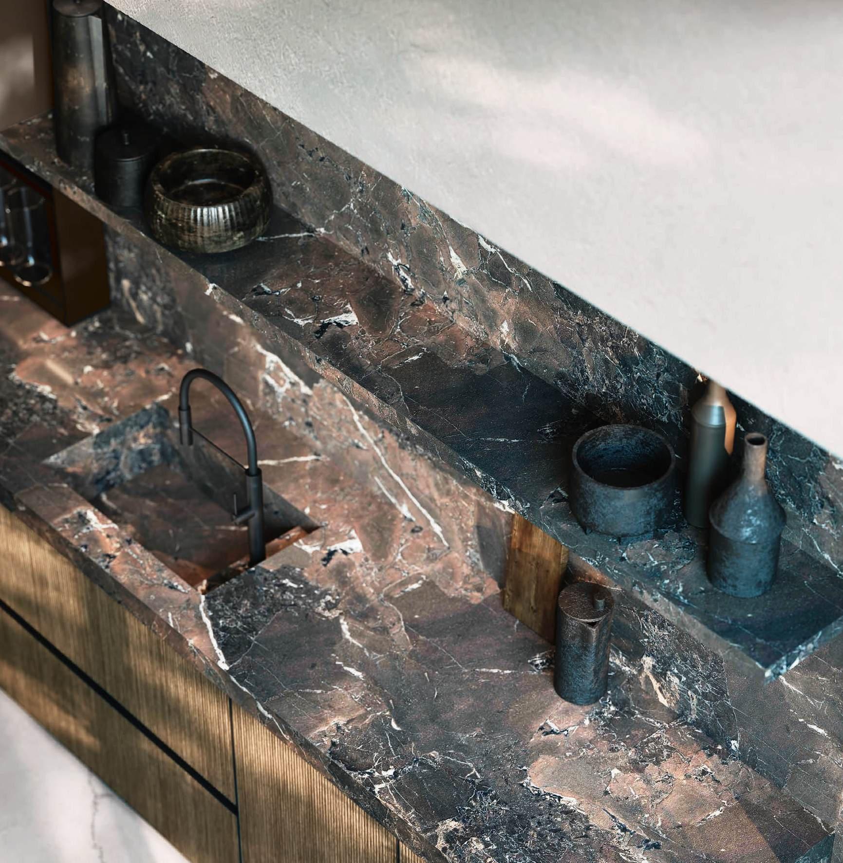 Dettaglio composizione angolare costituita da zona lavaggio con worktop ad alto spessore (8cm) in grès Breccia Imperiale bocciardata. Catturano l’attenzione le basi Avola in Rovere Grigio Pepe