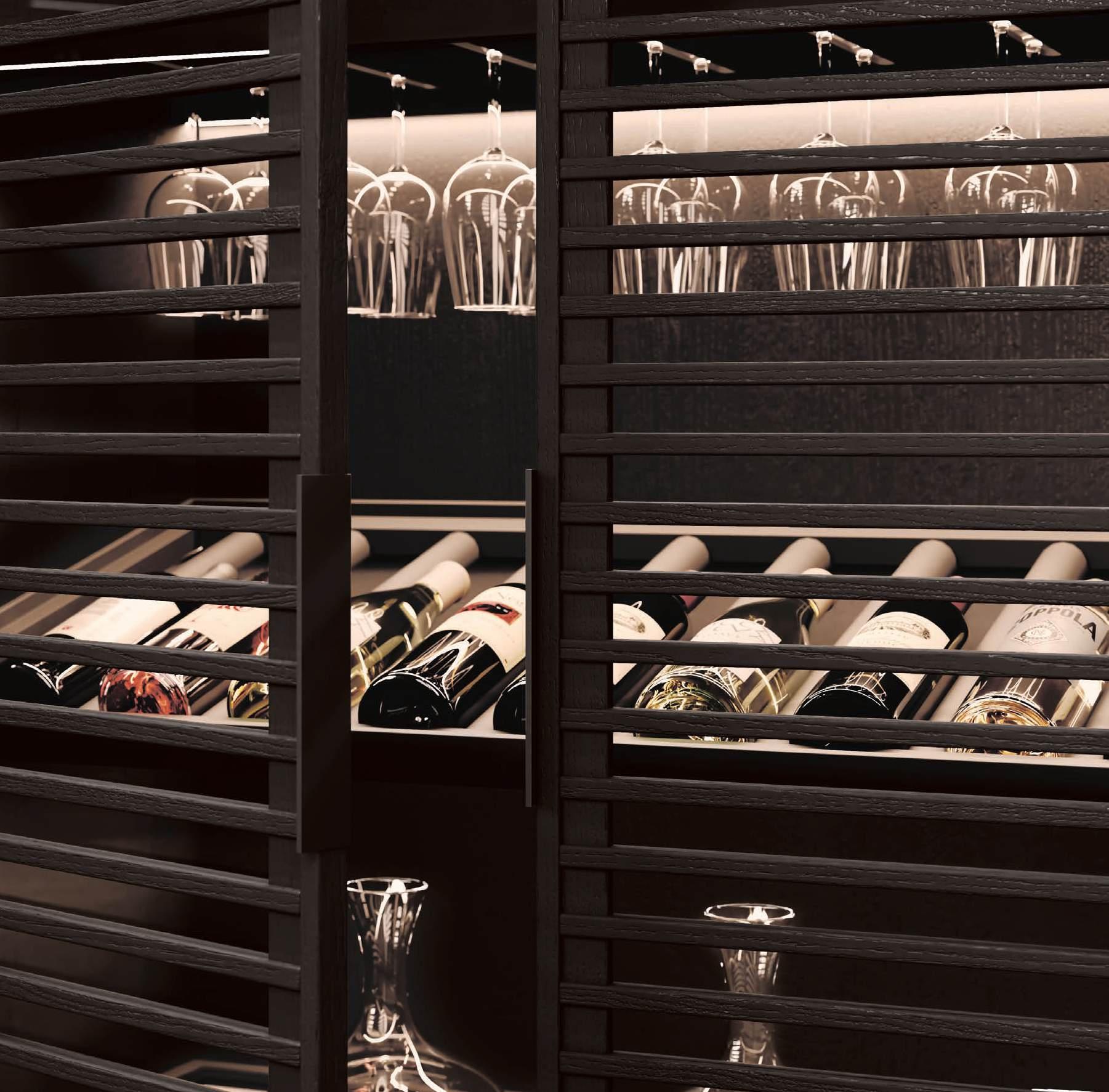 L’illuminazione LED delinea ogni ripiano che è stato appositamente progettato per la sistemazione di bottiglie e bicchieri.