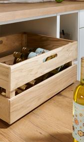 The traditional country look captivates with intricately crafted NORMANDIE panelled fronts and a whole host of decorative country style elements, such as vertically grooved dado panelling, perfectly proportioned end shelves and pilaster. The wooden accessories made of natural materials and the worktop in oak conjure an inviting ambience that conveys warmth and homeliness.