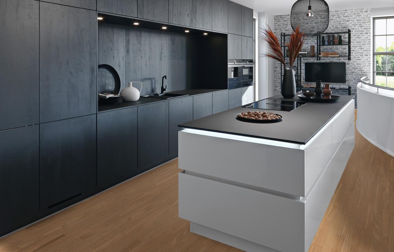 Die Programmlinie HAVANNA mit horizontal verlaufender Holzreproduktion in Chocolate Oak bietet genau das richtige Dekor für ein zeitlos schönes Küchendesign. Die schwarzen, supermatten Lackfronten LOFT erzeugen dazu einen spannenden Kontrast. Mit dem bodentiefen Pocketsystem als Einzel- oder Doppeltüranwendung können clever Elektrogeräte, Spül- oder Kochbereiche hinter einer großen Auswahl an Fronten verborgen werden und sorgen so für ein rundum wohnliches Ambiente.
