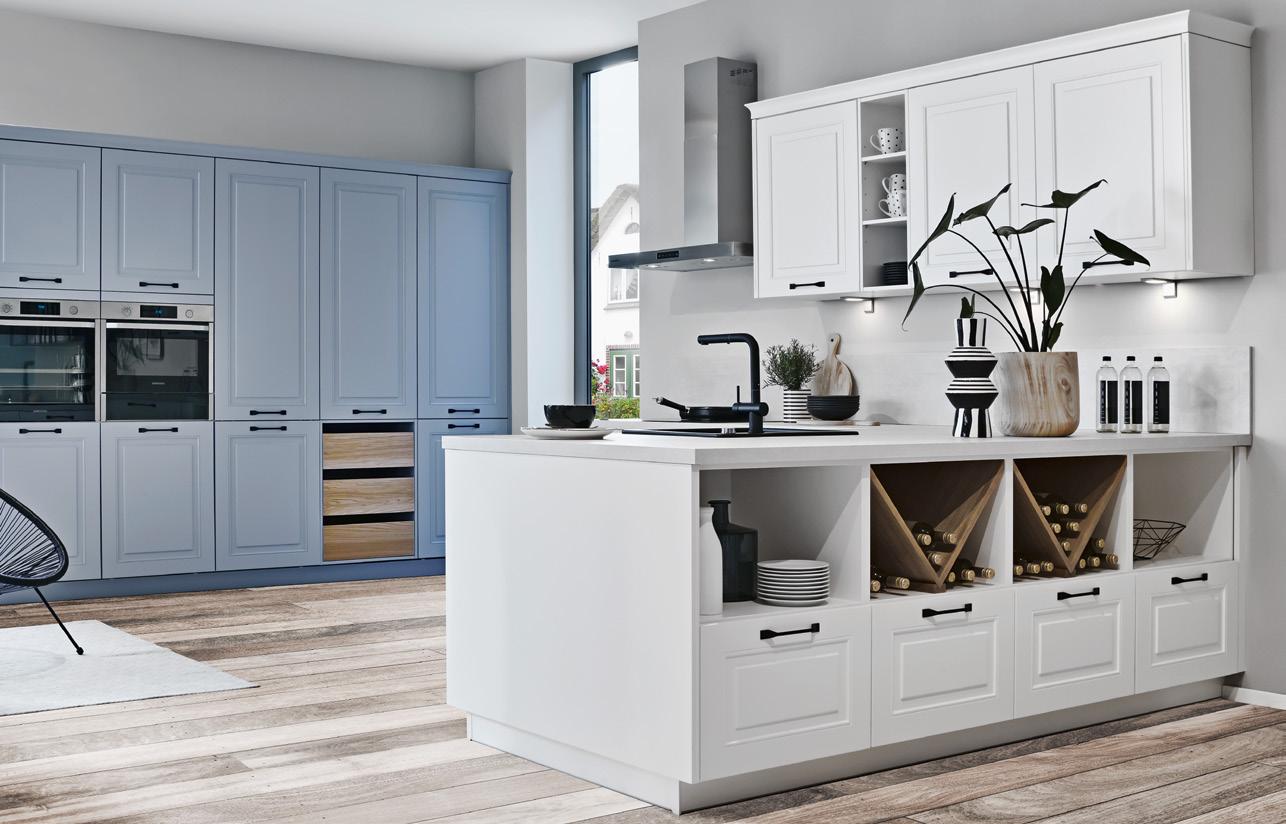 Uniting admirers of the country look across the globe is their passion for exquisite craftsmanship and authenticity. The natural, homelylooking spirit of the age is defined by classic framed fronts finished in elegant lacquer or high-quality real wood in combination with many characteristic country-kitchen attributes, such as glazing bar doors, end-of-unit shelving, dado panelling and solid wood elements in the form of wine racks.
