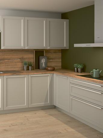 Hier wird das gemeinsame Kochen und Genießen zum Vergnügen. Die moderne Landhausfront PIEMONT in den Farben Pearl und einem stimmigen Grün aus dem RAL-Farbspektrum sorgen für spannende Kontraste und mit dem Holzdekor Arizona Pine für ein reizvolles Zusammenspiel.