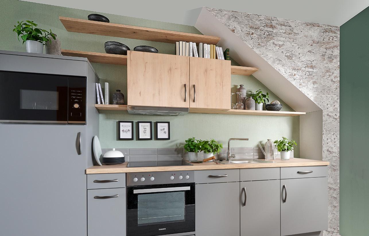This is where cooking and indulging together becomes a true delight. The modern PIEMONT country-style front in pearl and perfectly coordinated green from the RAL colour spectrum creates exciting contrasts and, together with Arizona Pine decor, make an appealing combination.