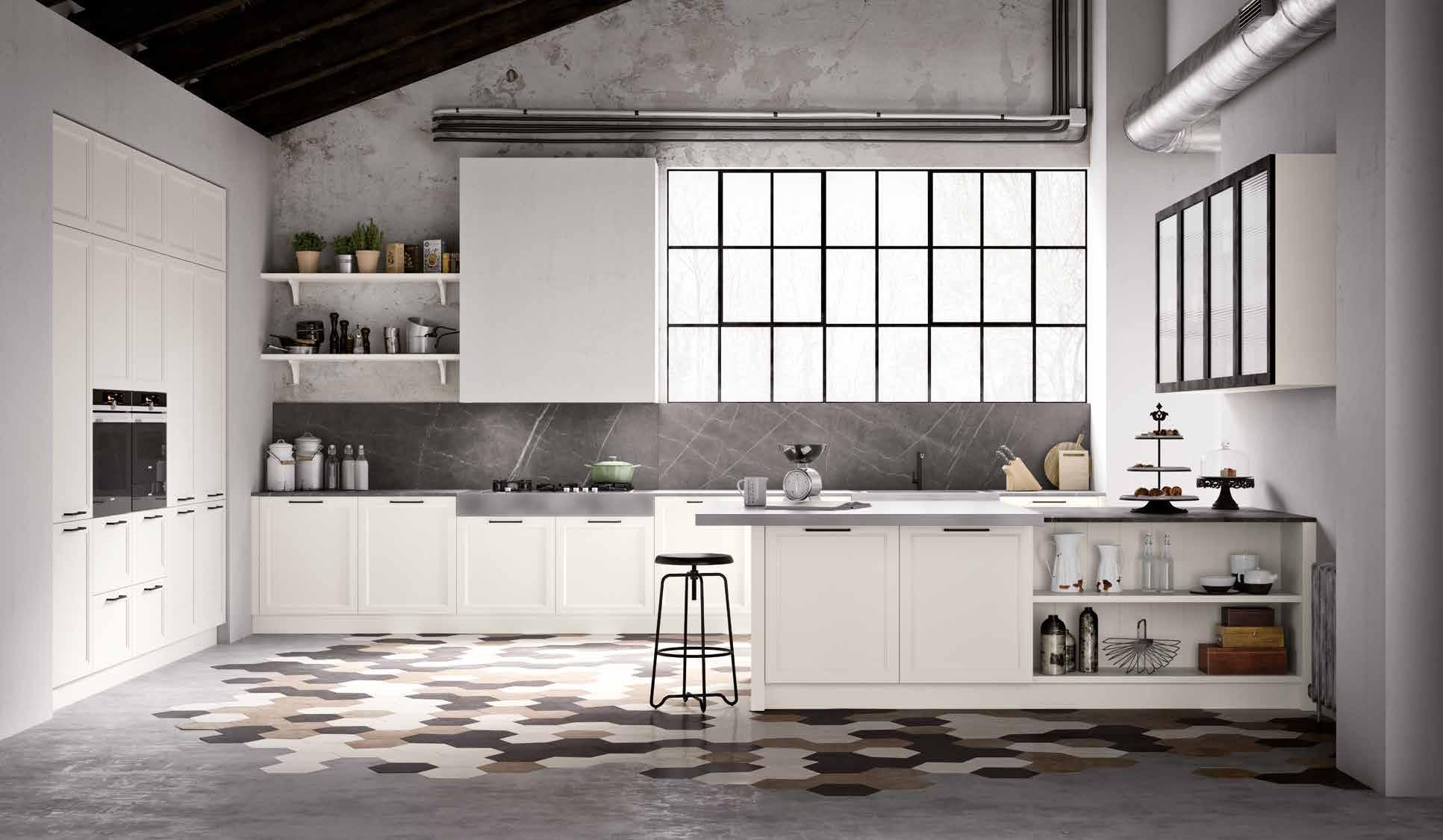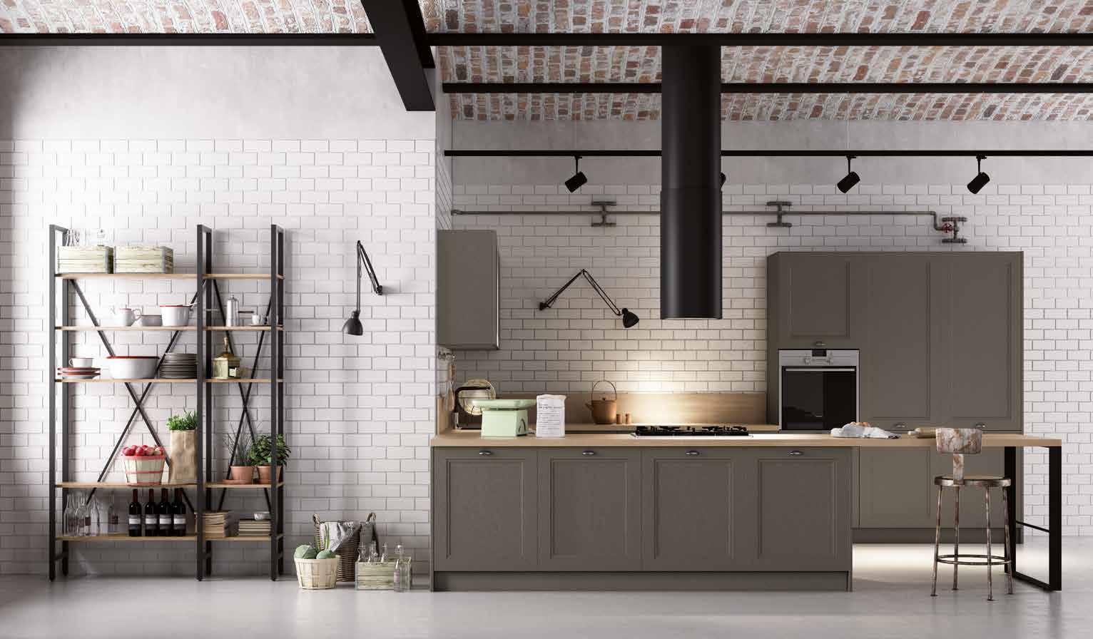 Together with technical materials such as stoneware and steel, the company refreshes traditional materials to make them contemporary. Wood, a solid durable material typical of classical does the glass brought back into use for kitchen wall units.