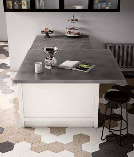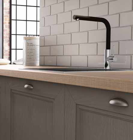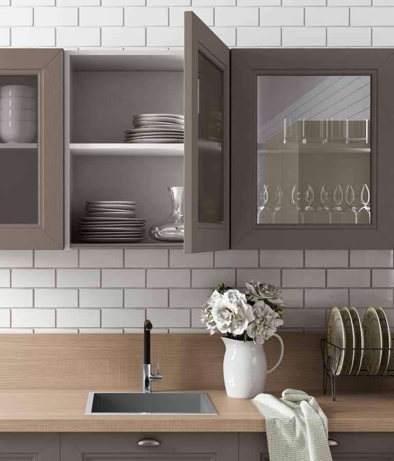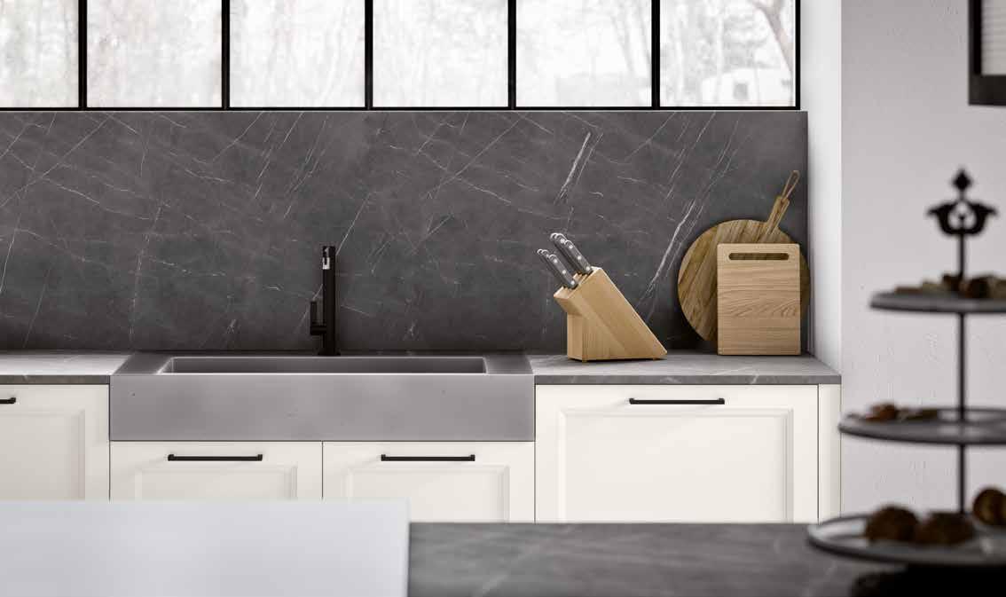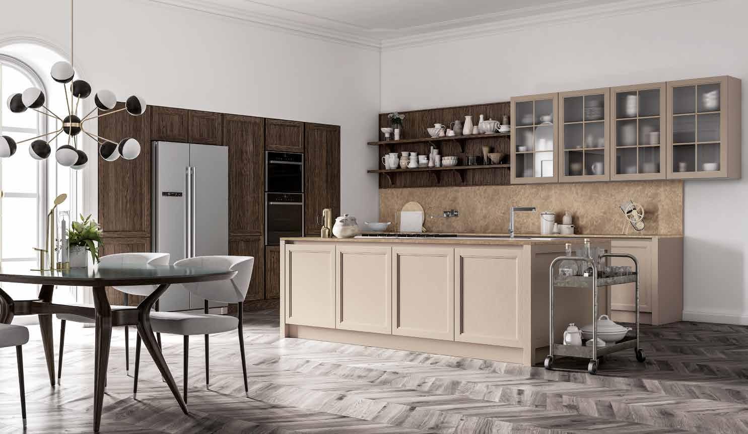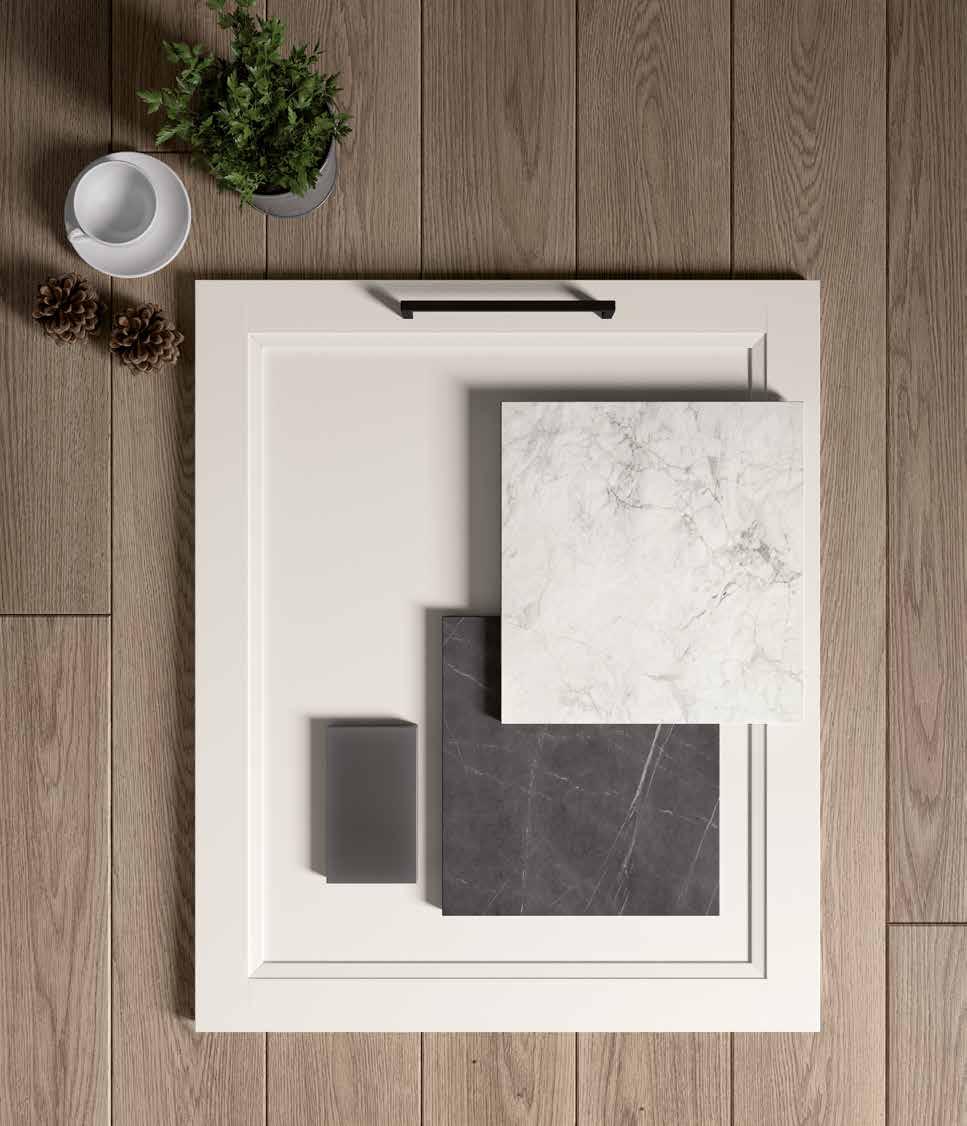 Es la combinación armoniosa de los bajos lacado poro abierto perla con encimera y trasera de mármol Mónaco light, muebles altos de tipo Inglés y columnas de roble torba.