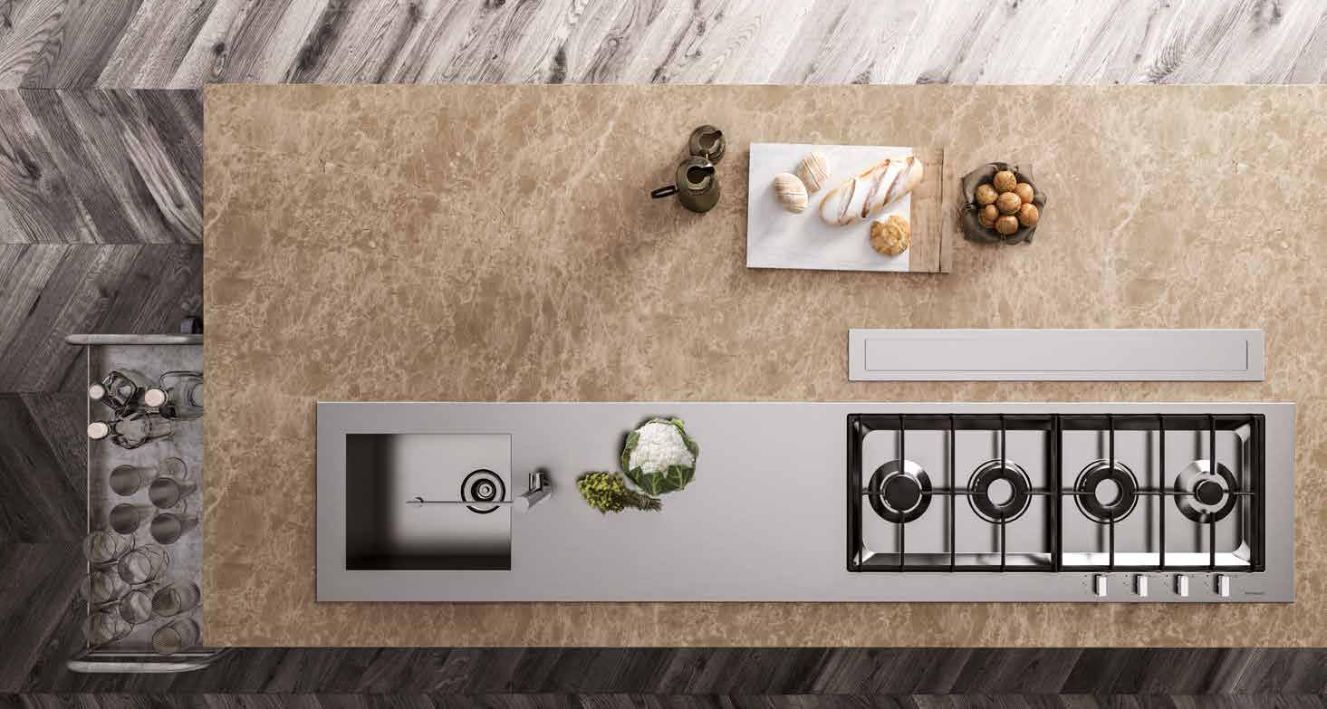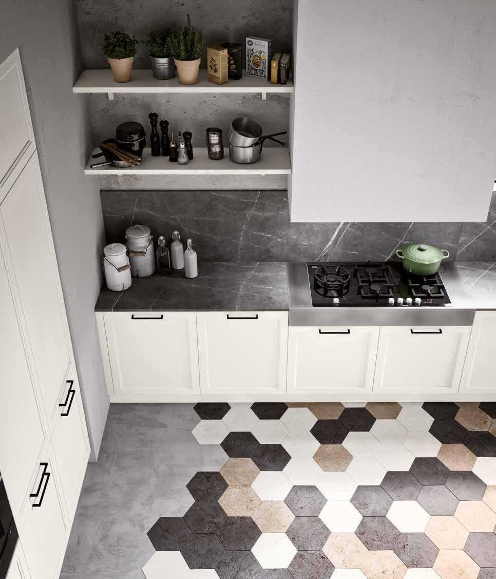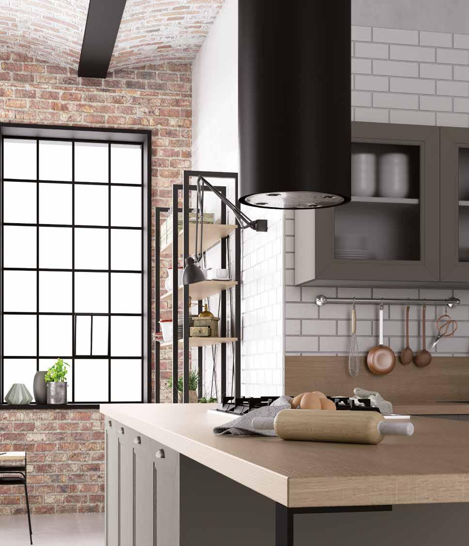 Junto a los materiales técnicos, tales como azulejos y acero, la empresa actualiza de una manera contemporánea a las tradicionales. Madera, material sólido y duradero que más que cualquier otro representa los muebles clásicos, está presente en varios acabados, así como vidrio, que vienen de nuevo en los colgantes de la cocina.