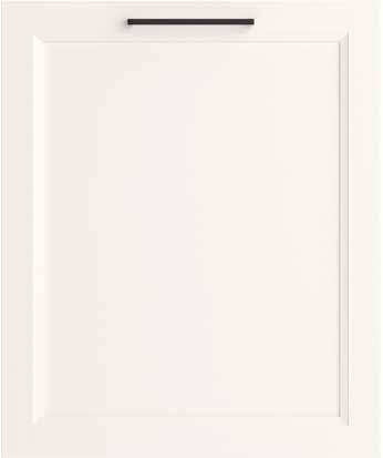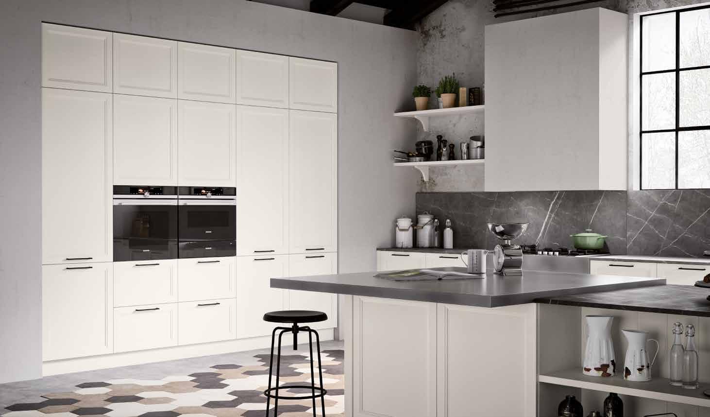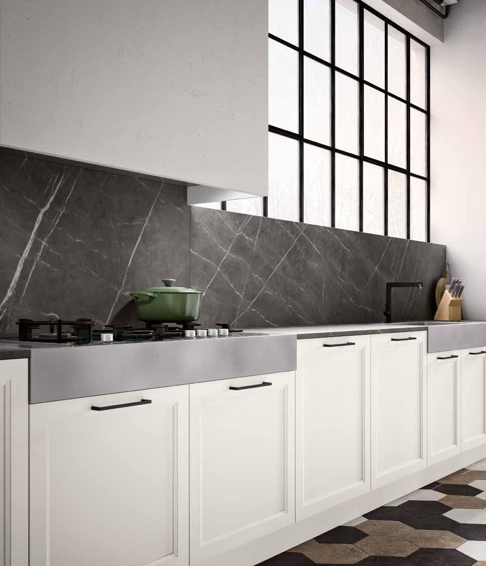 La geometría de la puerta Frame, enfatizada por l’ acabado blanco y con el tirador en puente de metal negro, está animada por la roca gris de la encimera y de la trasera.