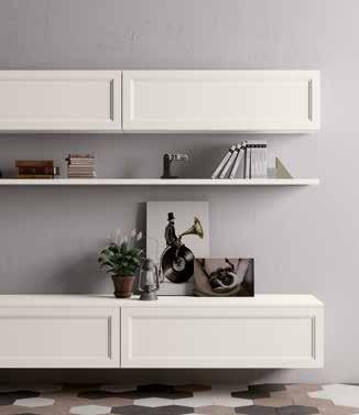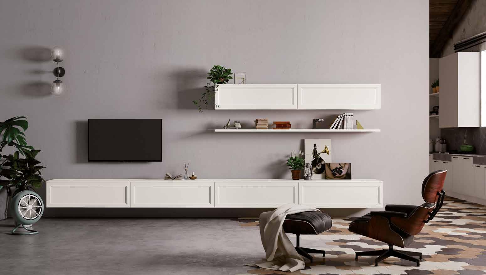 L’ouverture rélevable de l’élément haut valorise la porte qui n’a pas besoin de poignée. Dans les casseroliers des éléments bas, vous pouvez mettre tout ce dont vous avez besoin dans le salon.