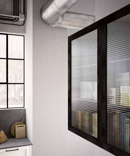 Les éléments hauts ont la porte avec le cadre en aluminium brossé noir mat et le verre armé, qui donnent un air vintage à la composition.