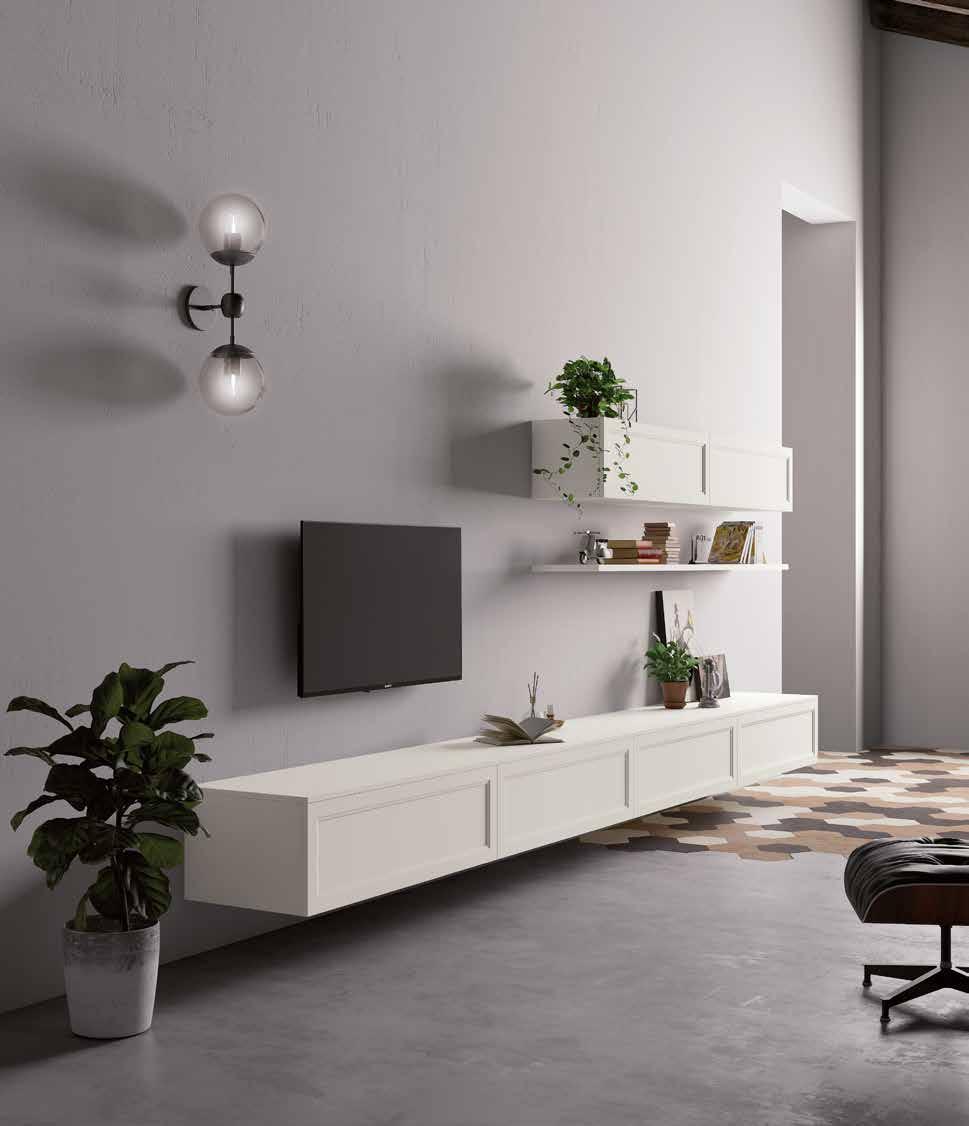 Mobile giorno sospeso con ante a ribalta e pensili a sviluppo orizzontale con apertura a vasistas e mensole, tutto in mdf laccato bianco opaco.