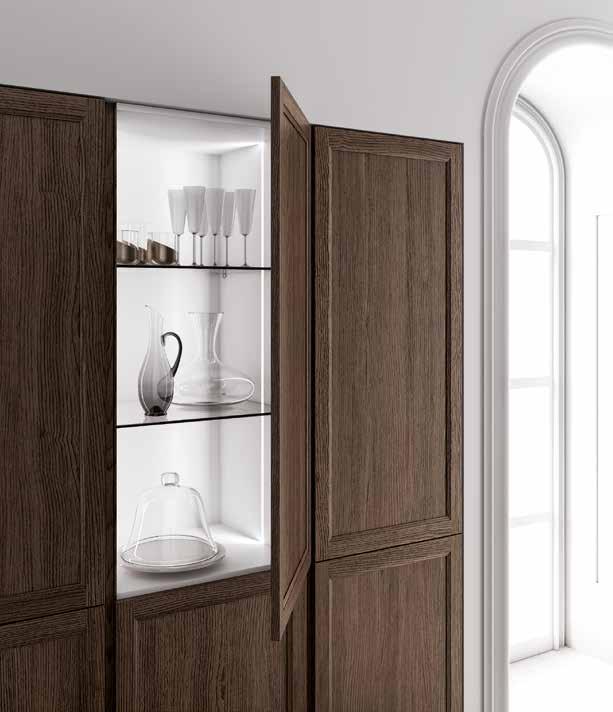 re-appear in the dining room, enriched by glass shelves with integrated LED illumination.