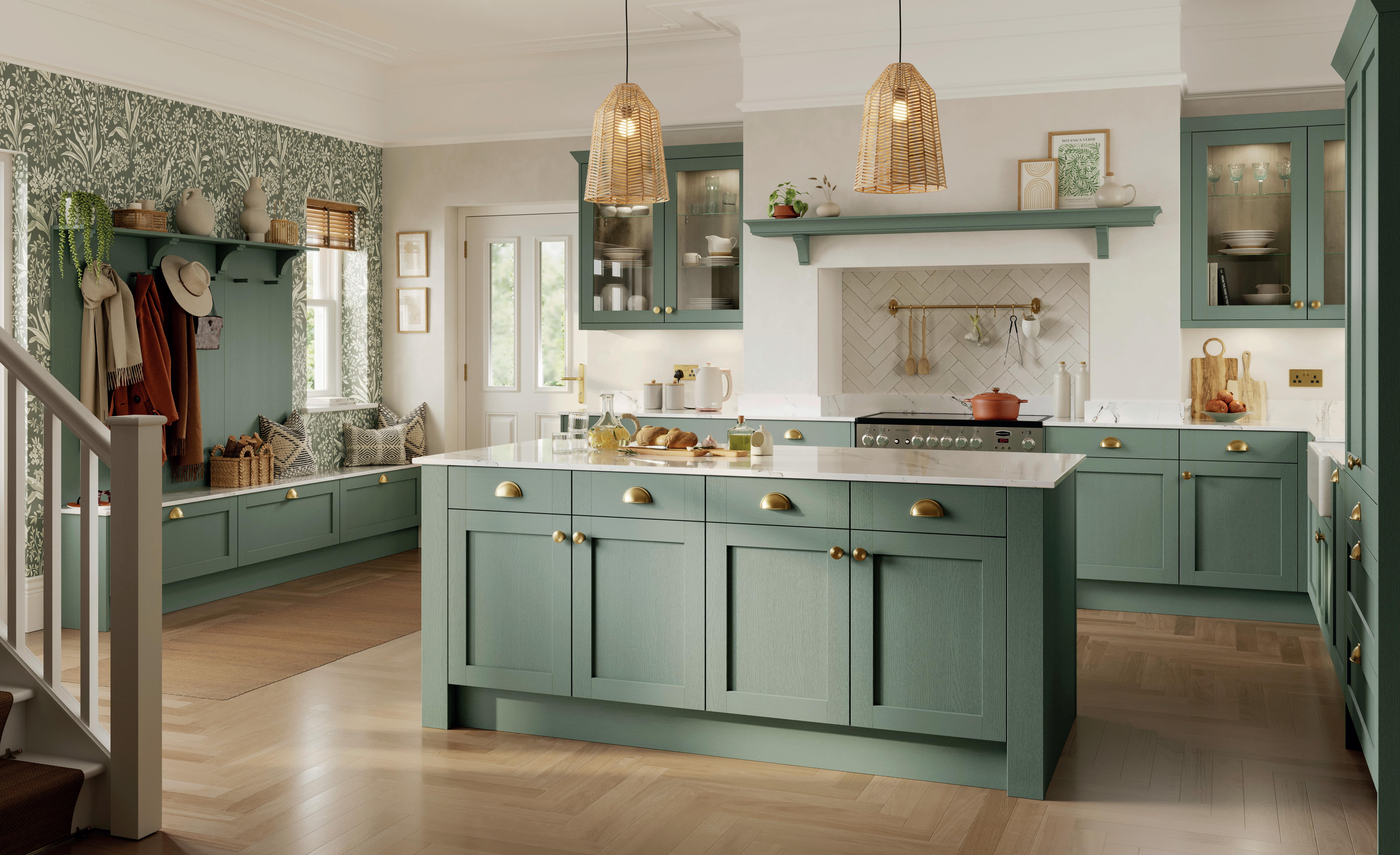 The dark and moody tones of Harvard Hunter Green create a sophisticated look which works well with a rose gold handle. Use a light coloured work surface to give this shaker kitchen a more modern look.