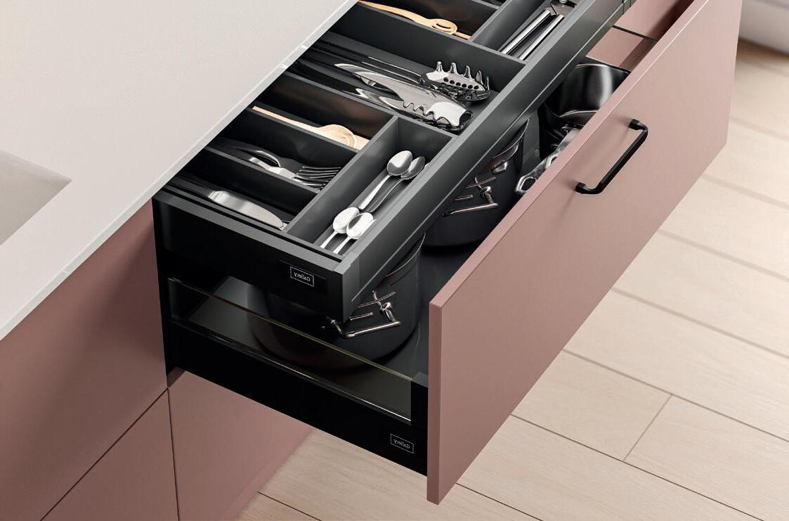 Metal-sided Atira drawer box with full extension and softclosing action.