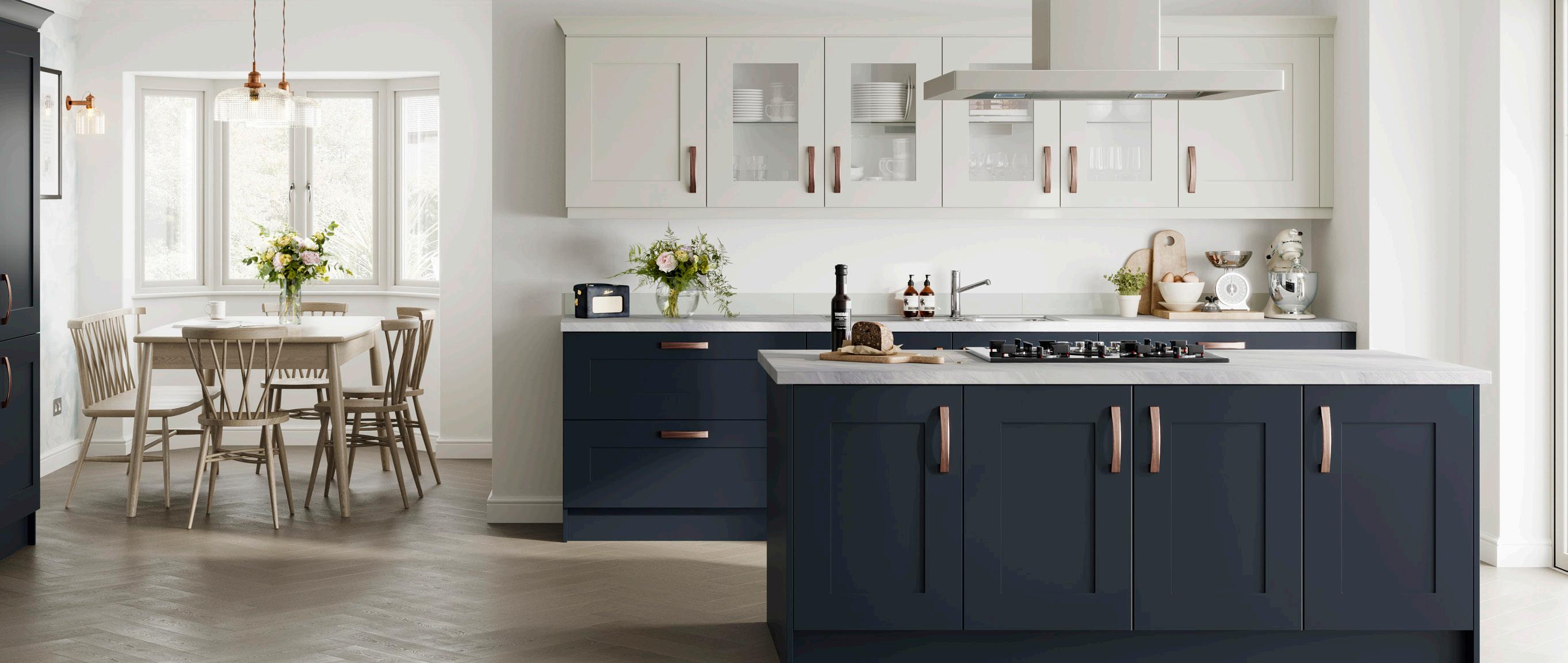 This exquisite grained shaker design features a chamfered frame and is available in a standard Ivory finish, as well as our full palette of paint to order colours, including the ontrend deep indigo shown here. Choose brass or copper handles to create a sophisticated kitchen to suit your home design.