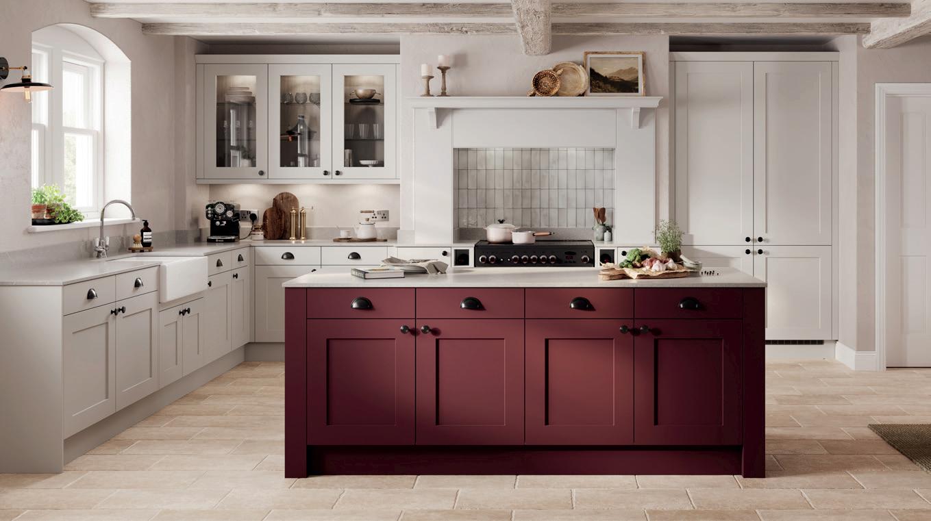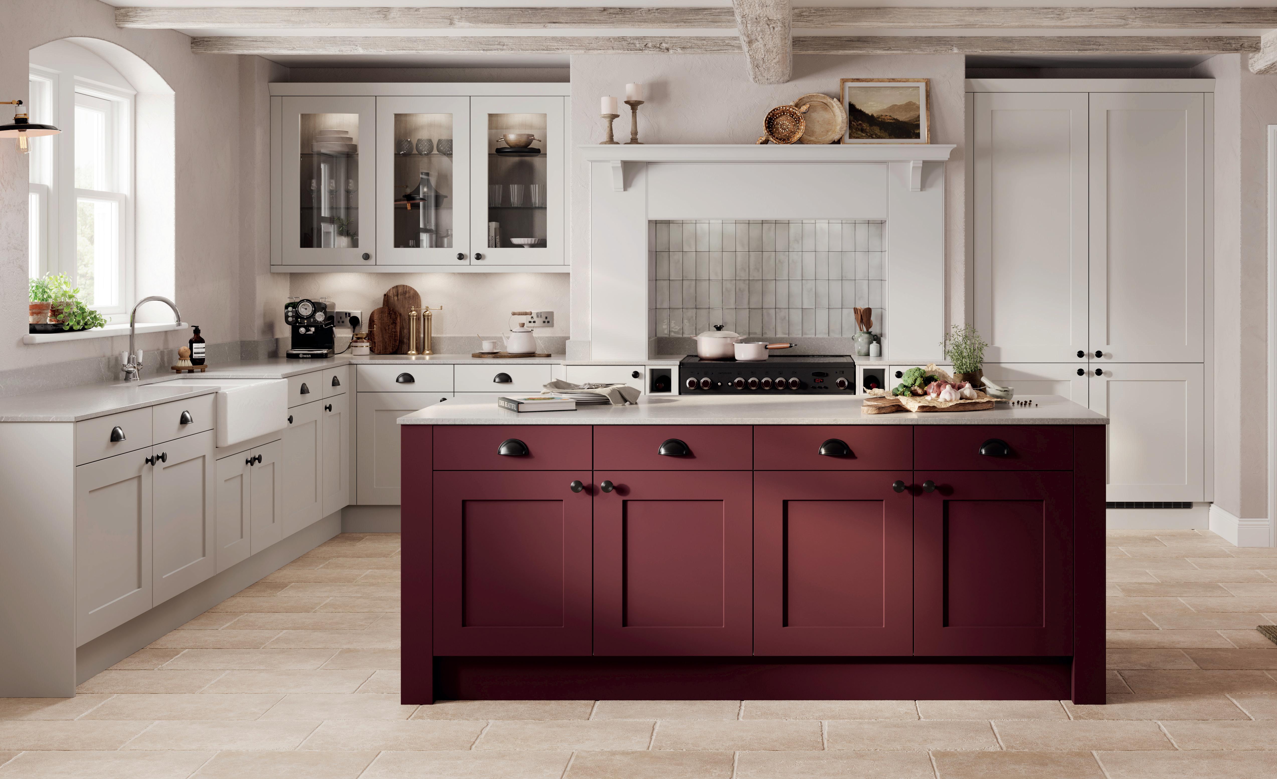 The handle choice and the work surface make a big impact on the overall style. The choice of colour is also influential with a traditional look being created by using colours such as Hunter Green, Sage and Stone, complemented with an Oak work surface and aged brass handles. For a more modern look use black, deep blue or green tones for frontals or be a bit more bold and choose our new Carmine Red colour.