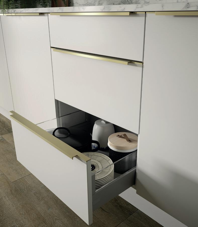 The Linear product specification includes 18mm cabinets supplied with solid backs, a choice of cabinet matched matt aluminium, matt black or matt white PVC or ABS cabinet edging and soft-close hinges/drawers as standard. Wall cabinets are 330mm deep to maximise storage space and are supplied with an aluminium integrated and concealed handle trim. Base cabinets are notched to accept the trim and are available either in a full height or with soft-close drawers.