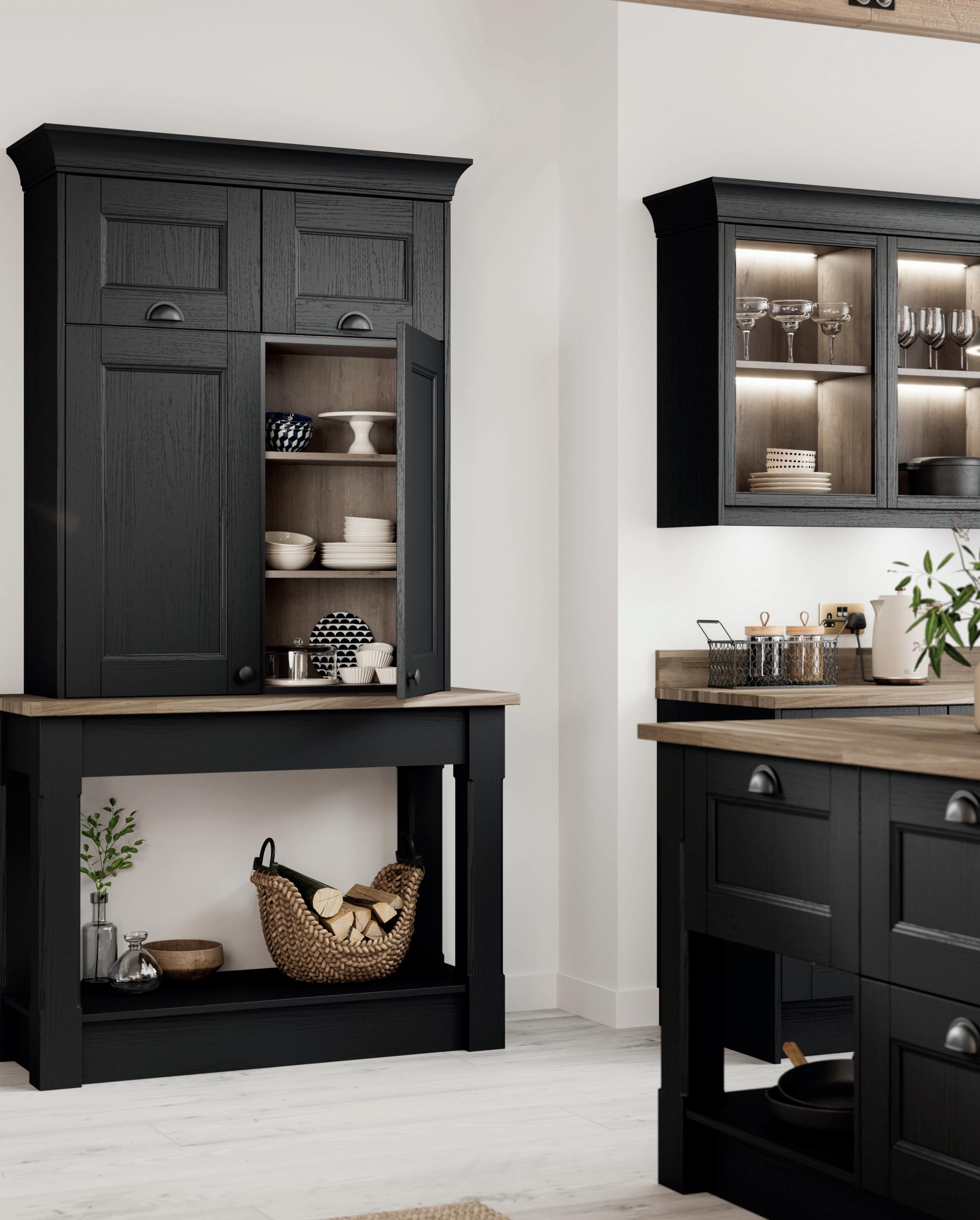 Charming, pretty and beautifully versatile, Waterford Paint to Order is a painted ash veneered shaker kitchen. It features intricate beading around the shaker frame that gives the design its classic style. Pick a paint colour to suit your home such as black with our black cup and knob handles.
