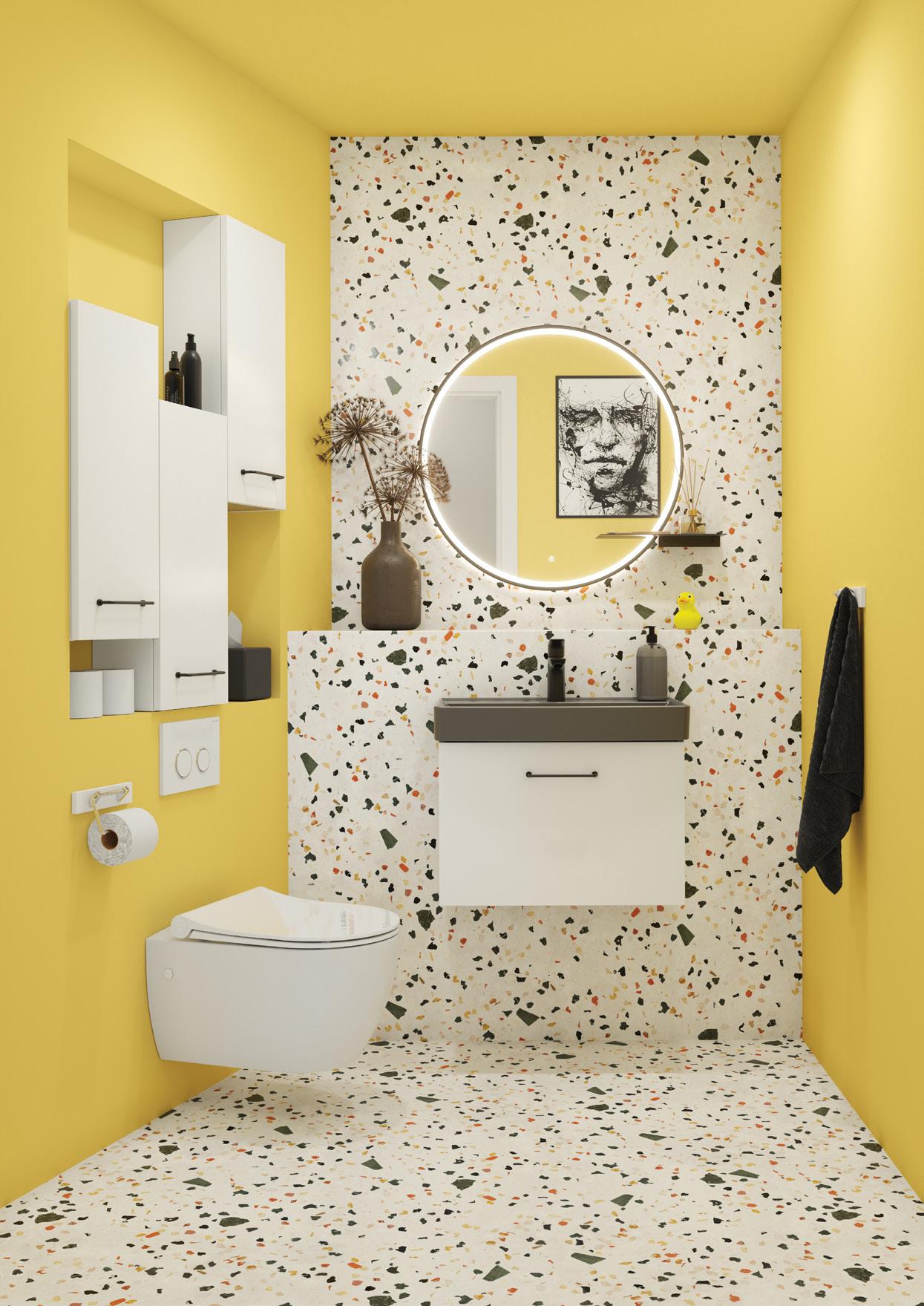 Mido+ Classic in our solid light blue decor looks great in a small, smart bathroom when combined with a warm colour on the walls. An on-trend look to bring a smile to your face.