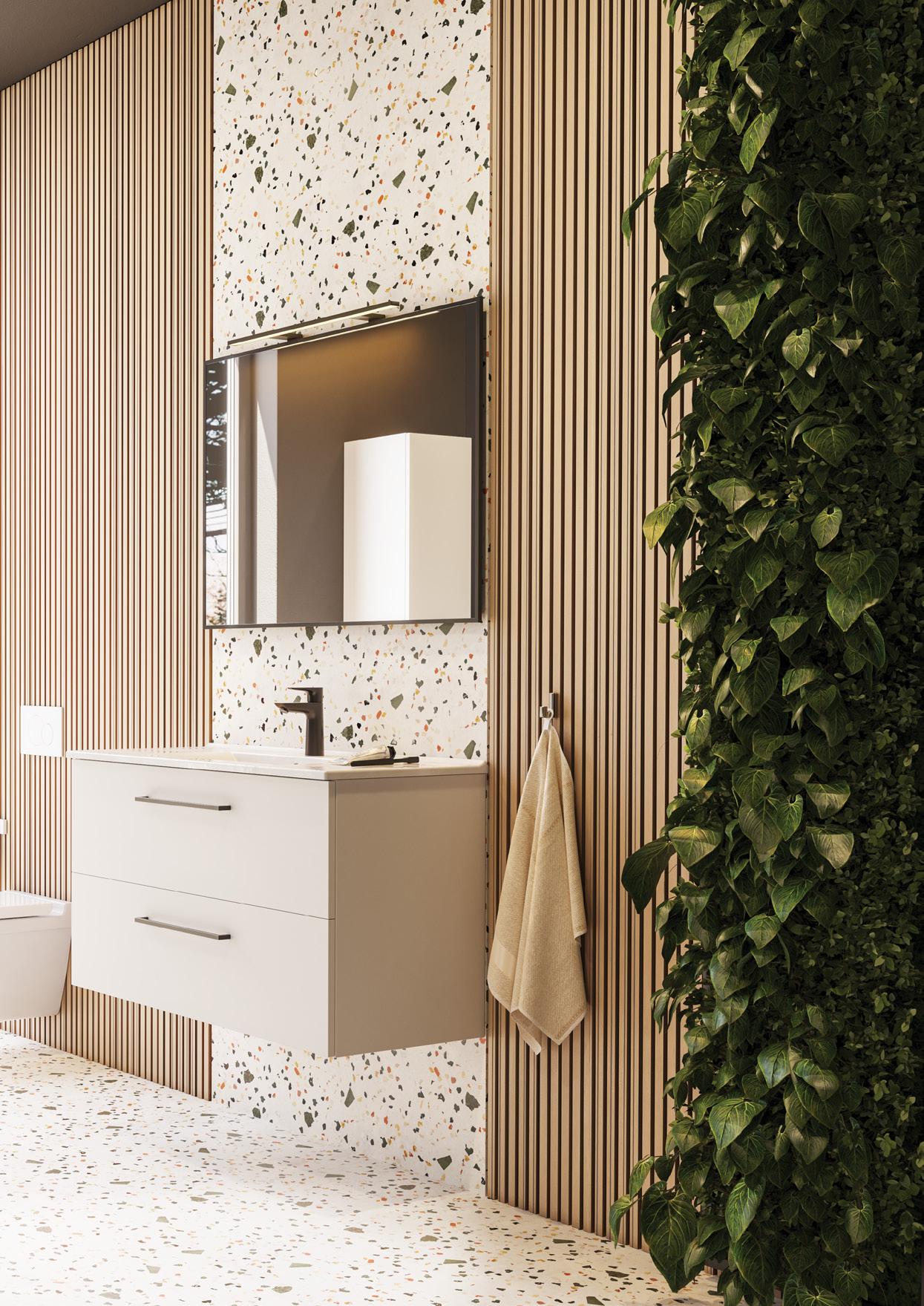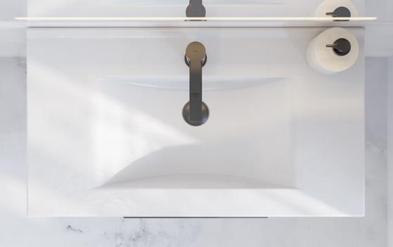 Is your bathroom narrow? Then choose a vanity unit that is just 35cm deep, but as wide as you have space for. The classic and practical Lotto porcelain basin or as shown here the new Marbelique marblecast basin are both great choices for narrow bathrooms.