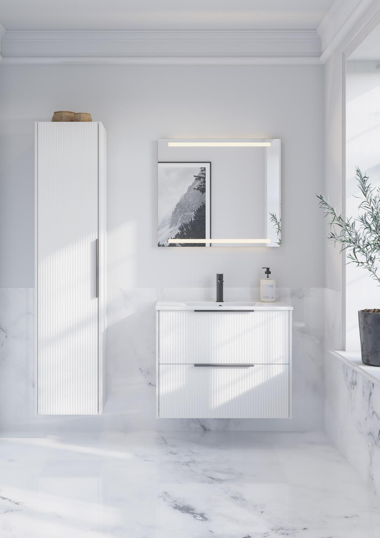 A classic white-on-white bathroom where the fluted fronts of Mido+ Classic add beautiful nordic elegance.
