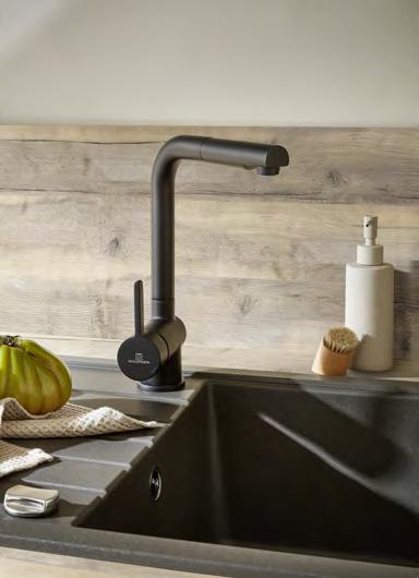 Schöner spülen: Zeitgemäß präsentiert sich eine Spülzone mit Ablaufgarnitur in Mattschwarz.