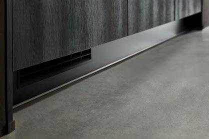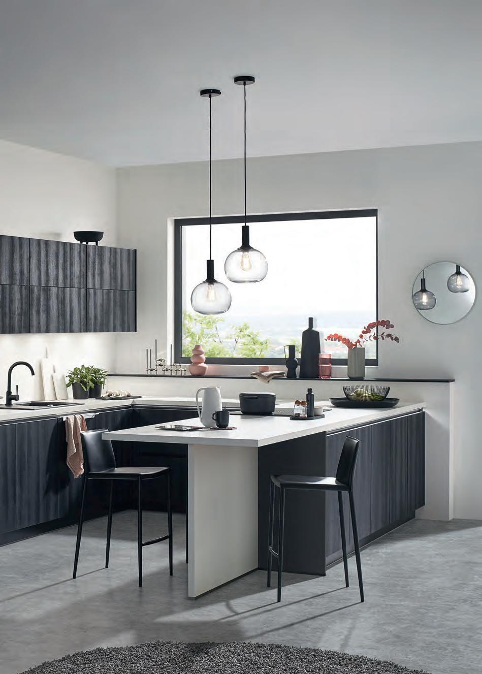 Every wall is different, and often not quite straight: base units with extra-deep carcase sides easily compensate. LED spots present the worktops in exactly the right light. The sink area in matt black perfectly matches the design of the fronts.