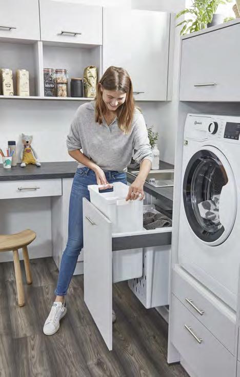 Raised to a height for your convenience: modular cabinets accommodate electrical appliances. Sturdy pull-outs provide storage space under the washing-machine and tumble-dryer drums. This makes a pleasure of getting the washing done.