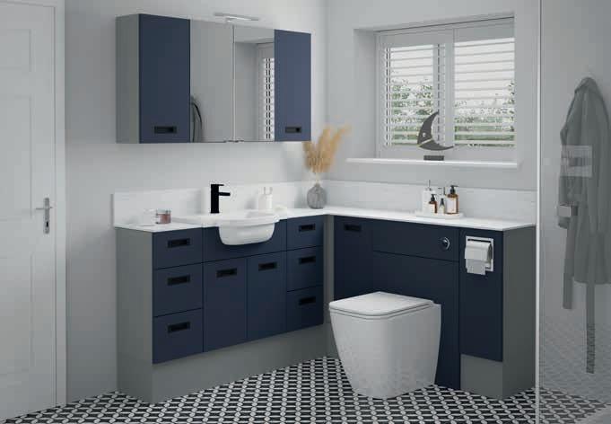 Daresbury Matt Fjord with Largo Orlo combined basin and worktop, Piaza Mini-Mono Basin Tap and Quadra Rimless Back to Wall pan. Doors shown fitted with BCHA908 Chrome Wave handles.