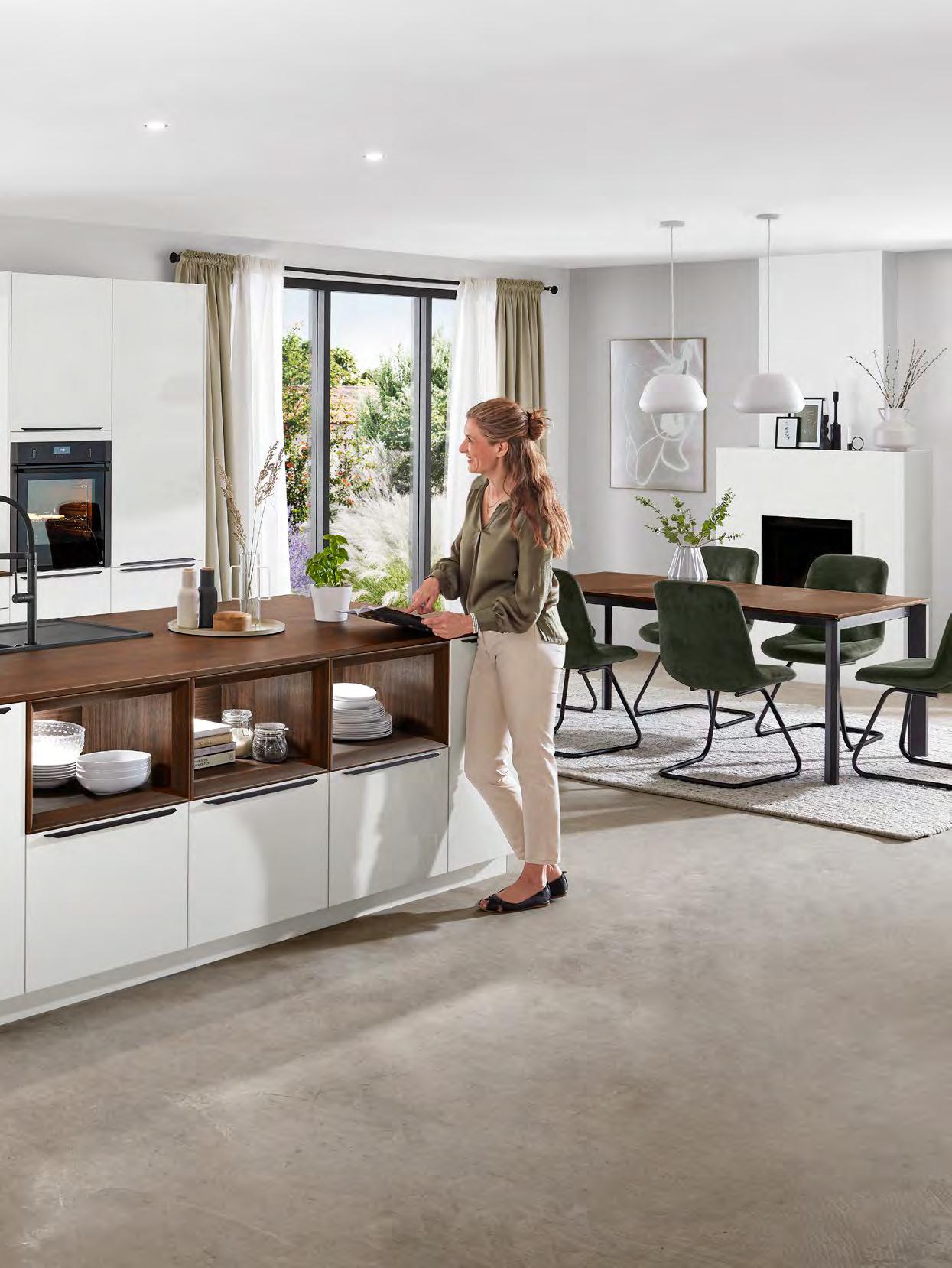 The jade trend colour is now mixing up kitchen design and providing fresh energy. The sideboard with open wall shelf integrates perfectly into the harmonious overall design. Tailor-made for Sally: ‘Design, storage space and smart functions are the perfect combination for me in everyday kitchen life.’