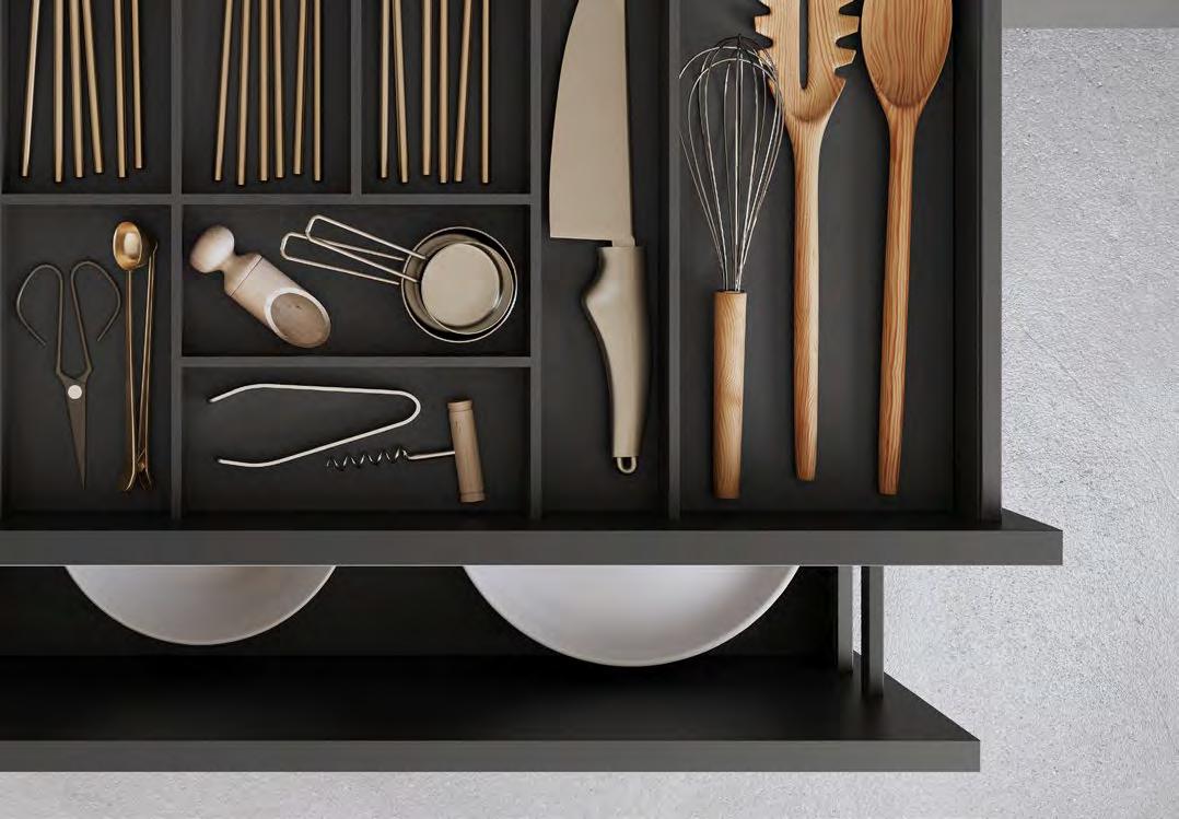 LINE One combines single-track recessed handles with the push-to-open feature for the lower pull-outs.