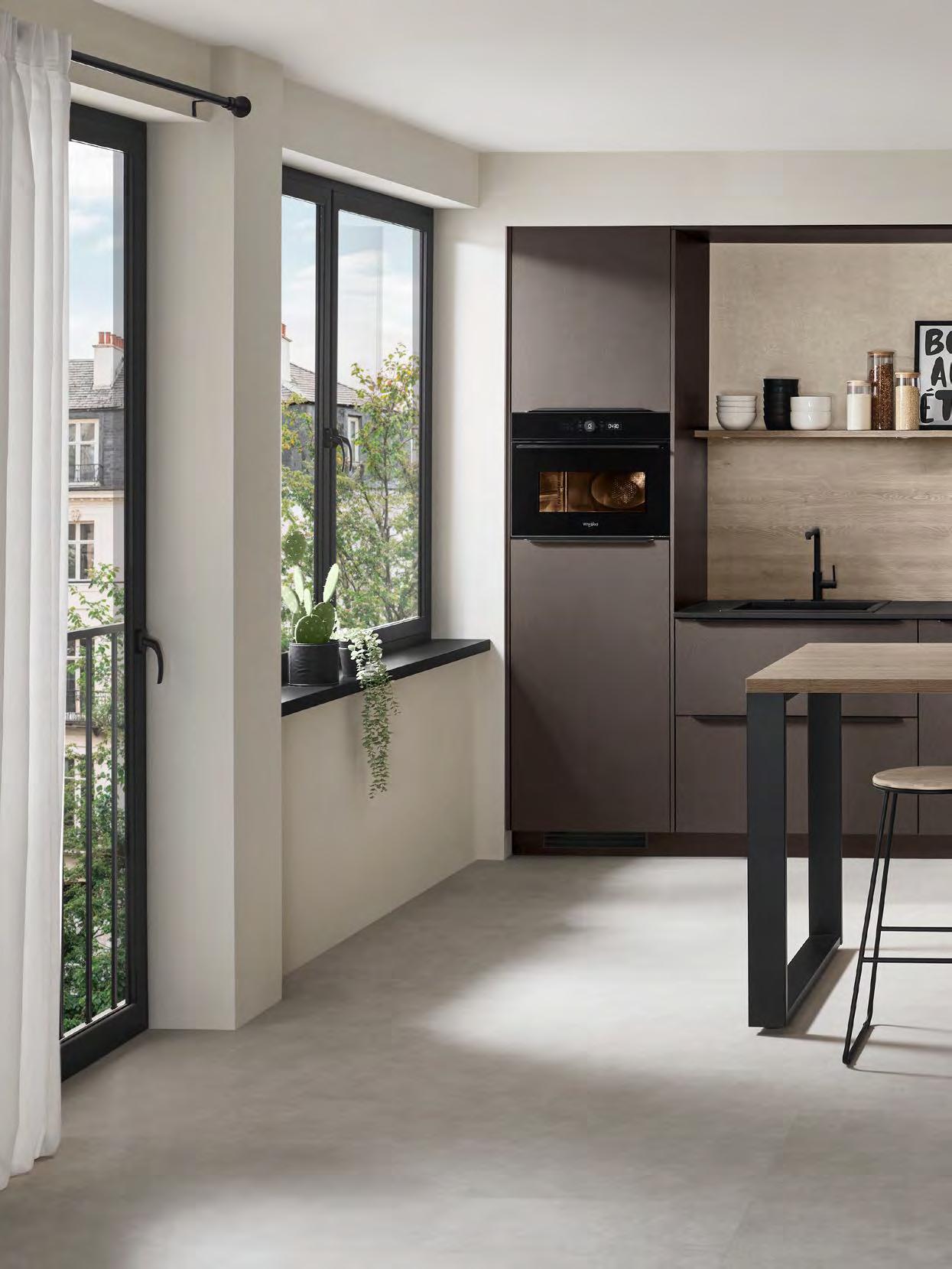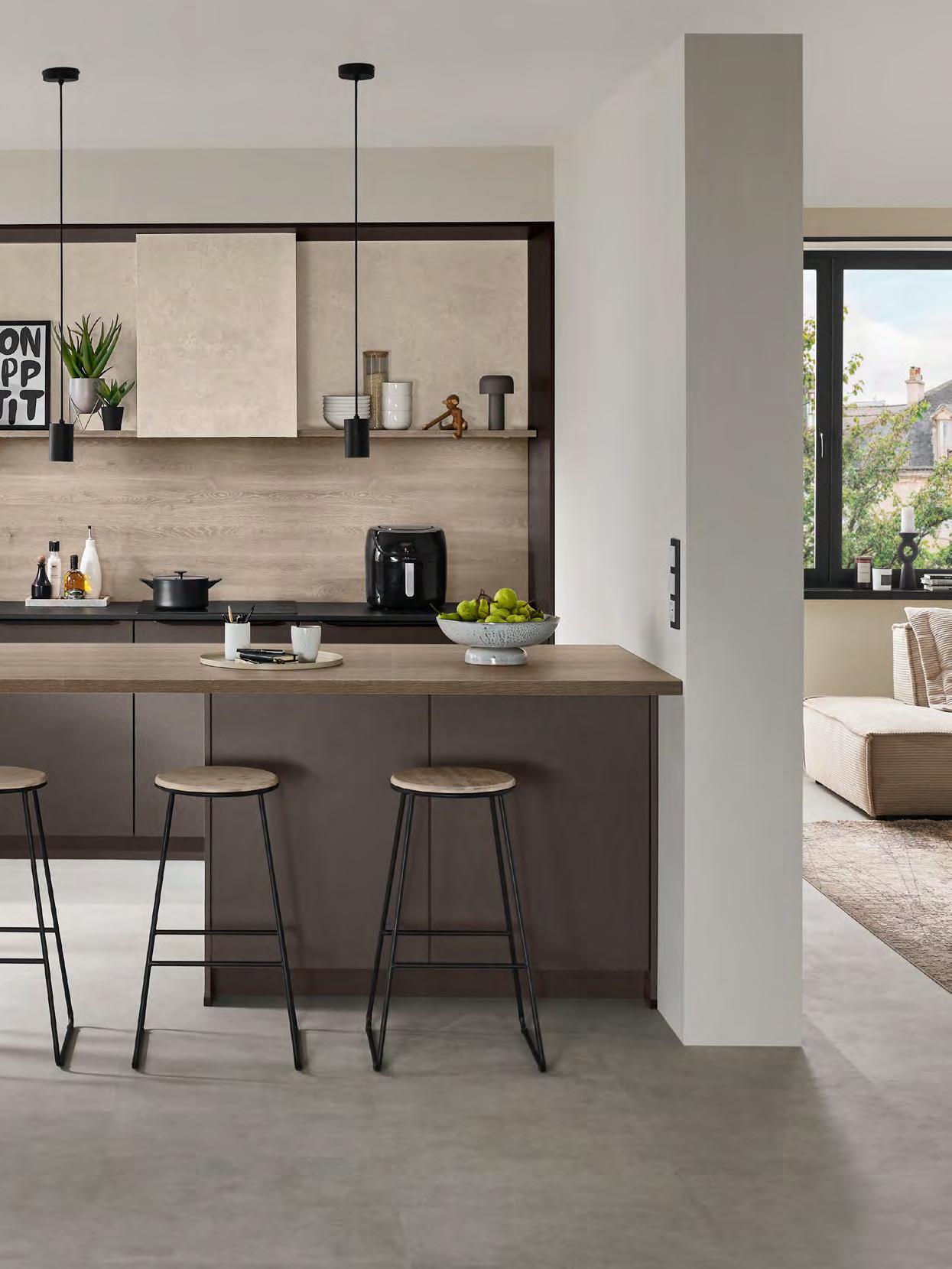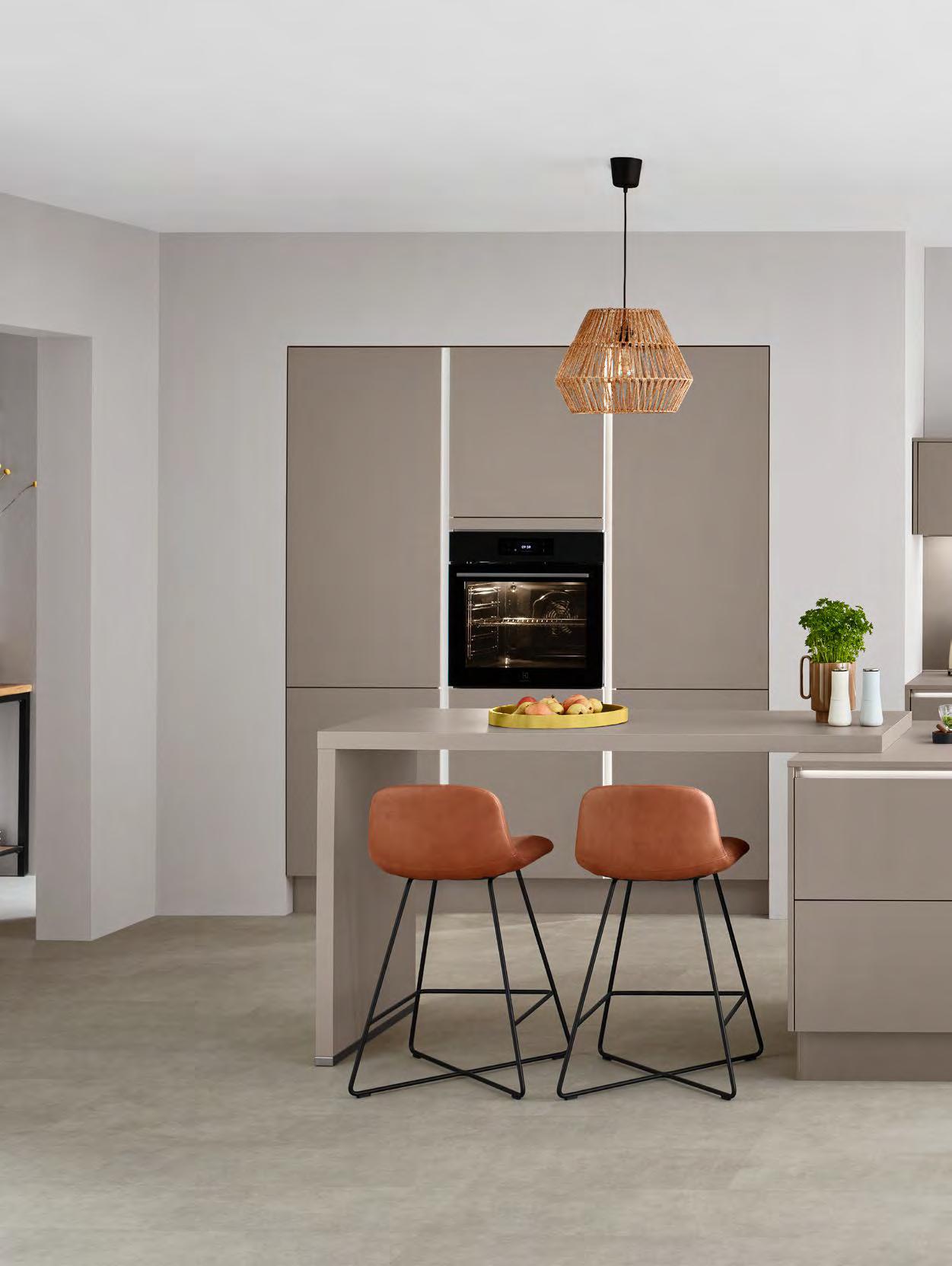 This kitchen provides a tasteful setting in which to unwind at the end of the day. The dark, sophisticated coffee hue lends a comforting warmth. The spacious atmosphere boasts sleek and streamlined aesthetics, while offering plenty of space to cook. The two kitchen islands –along with the countertop tying them together – are the centrepiece: open and inviting, designed for conversations and shared moments.