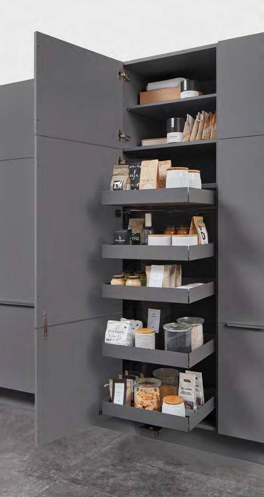 Our entire pull-out system and interior are characterised by a linear, minimalistic aesthetic in shape and colour. Whether as standard with a square railing, optionally with a glass side, glass panel or as a closed pull-out box: our multifaceted design options perfectly match your style and requirements. Add a personal touch with profiles and covers – subtle tone-on-tone or as a stylish contrast. It’s not just the appearance that impresses, but also the convenient features. Even with its high total load capacity of up to 70 kg, the nBOX offers smooth operation.
