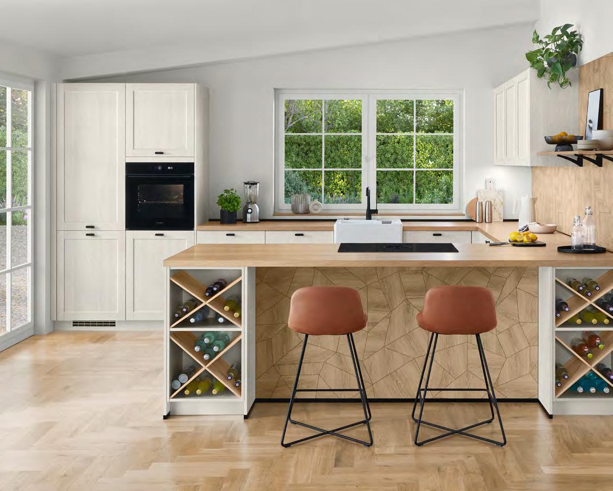 Die wasserunempfindliche Arbeitsplatte im authentischen Look mit antibakteriell wirkender Oberflächenbeschichtung microPLUS® punktet mit hoher Schlagfestigkeit. Die 3D-Oberflächenstruktur sorgt für eine naturgetreue Haptik und Optik. Ein flächenbündiger Einbau von Kochfeld und Spüle ist möglich.