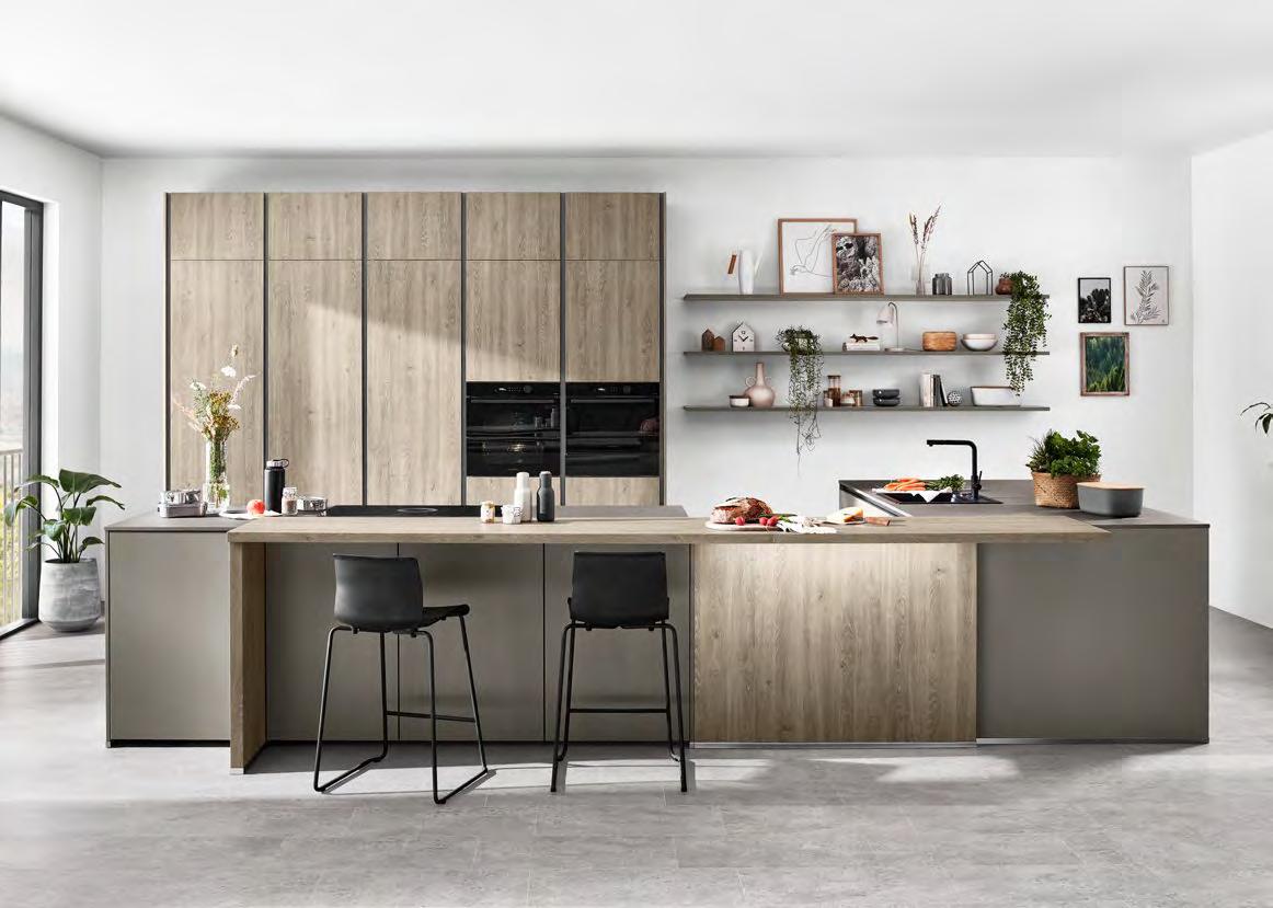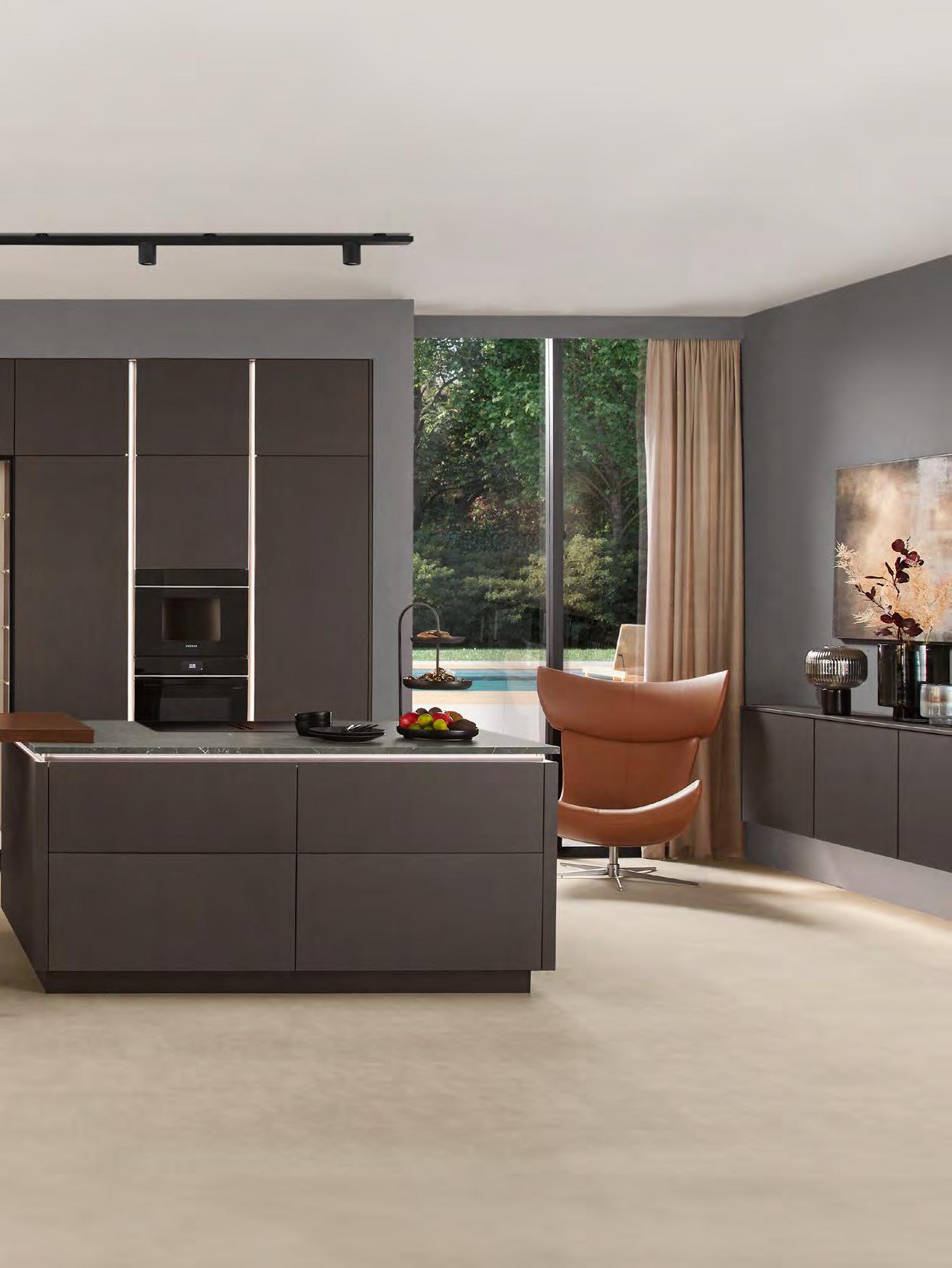 Diese Küche schafft einen geschmackvollen Rahmen, der zum entspannten Ausklang des Tages einlädt. Dunkel und edel in der Farbe Coffee gehalten, dabei wohltuend warm. Das großzügige Ambiente setzt auf klare, geradlinige Ästhetik und viel Freiraum zum Kochen. Zwei Kücheninseln bilden, zusammen mit der Thekenplatte als verbindendes Element, das Herzstück – offen, einladend, geschaffen für Gespräche und gemeinsame Momente.
