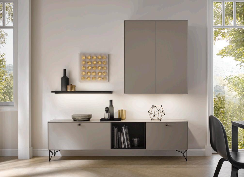 Brass-coloured knob, black handle strip, or perhaps no handle at all? Harmonise the sideboard's design with your living style. Sideboards best reveal their spatial impact when you display carefully chosen favourite pieces on their free surfaces – be it books, vases, or art objects.