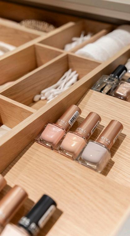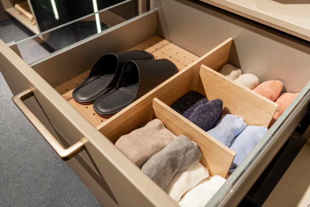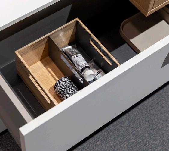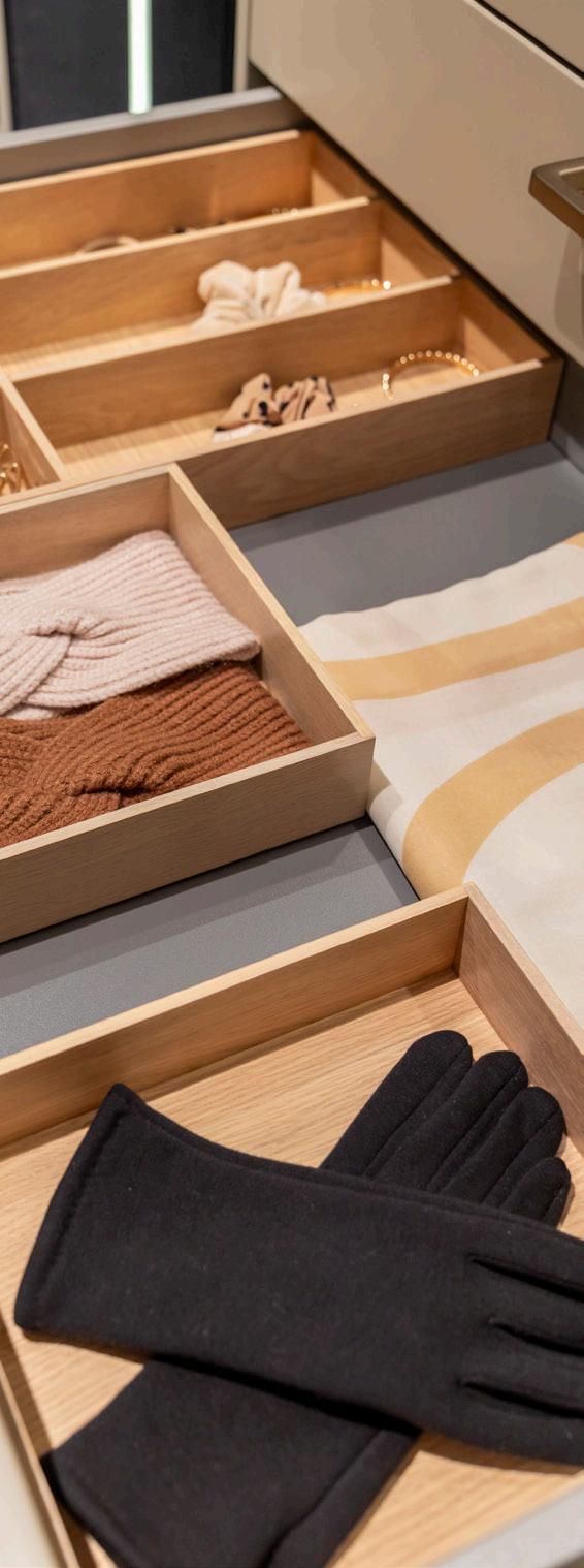 Our premium inserts in light beech or dark grey ash offer a practical and aesthetic solution for your drawers and pull-outs. They allow you to store accessories and clothing items in an organized, easy-to-view manner. Who knew organisation could be this beautiful?