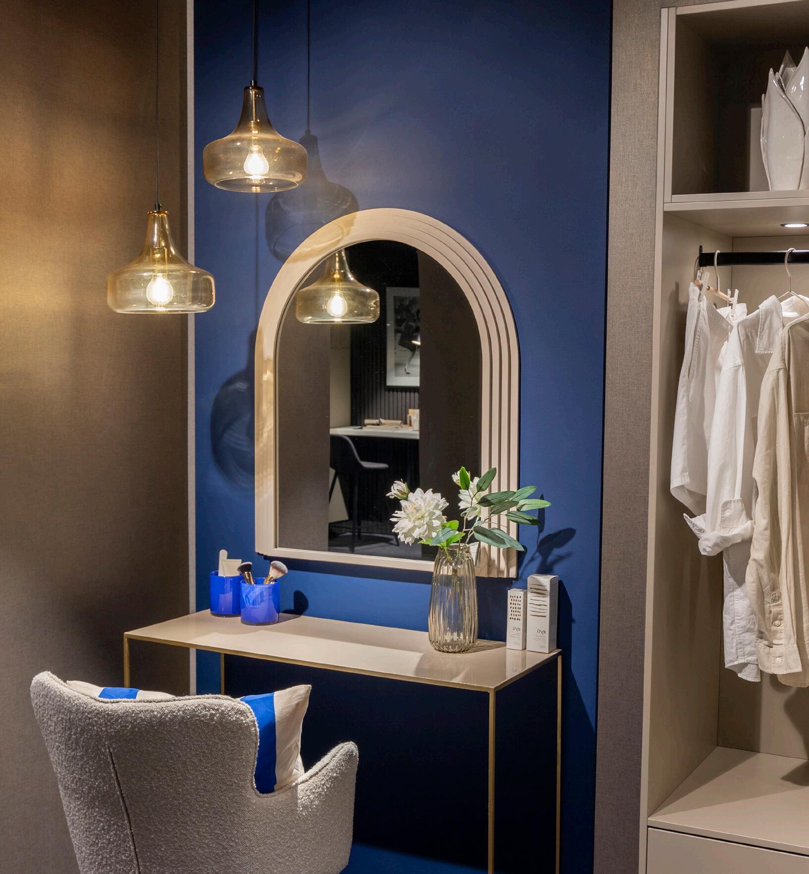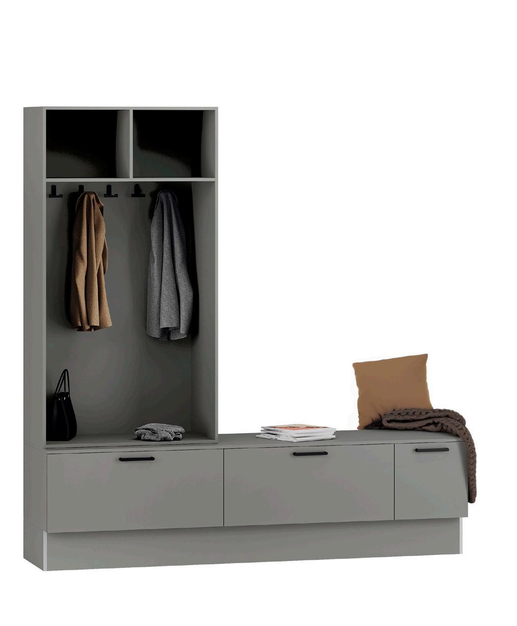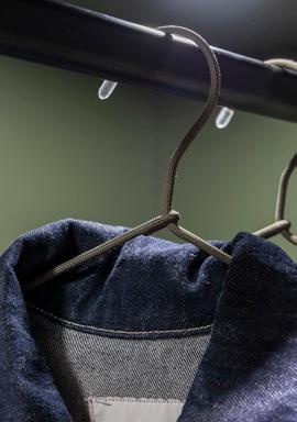 Voor de kleuring van de kleedkamer zijn warme kleuren zoals omer natuur uitermate geschikt, bij voorkeur in combinatie met expressieve contrastkleuren. Onze geheime tip: zwarte legplanken. Ze laten uw kledingstukken echt stralen.