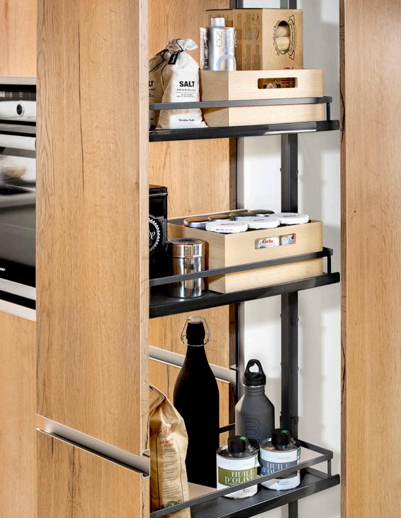 Más capacidad de almacenaje, imposible: los estantes del armario despensero ofrecen una gran cantidad de espacio y un cómodo acceso desde los dos lados.