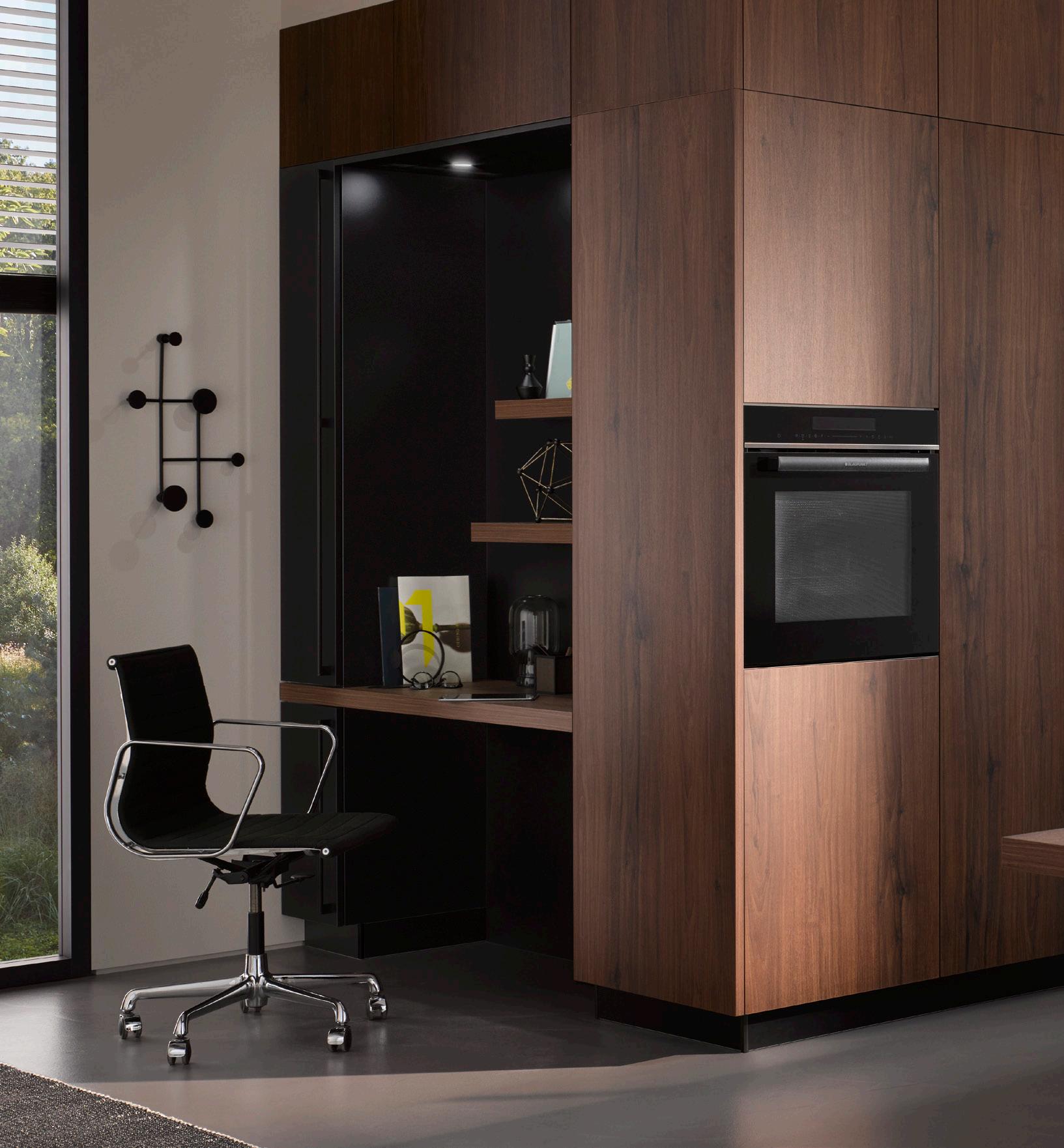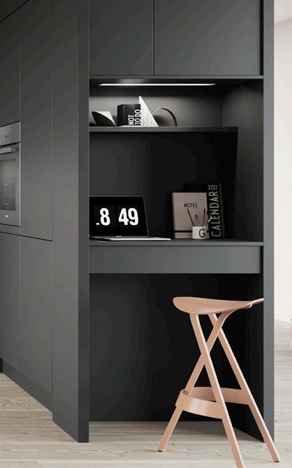 Los rincones previstos para la oficina en casa se integran perfectamente en las cocinas abiertas. Las distribuciones en esquina permiten crear una zona de trabajo independiente que se amolda en total armonía a la estancia gracias a un diseño uniforme.