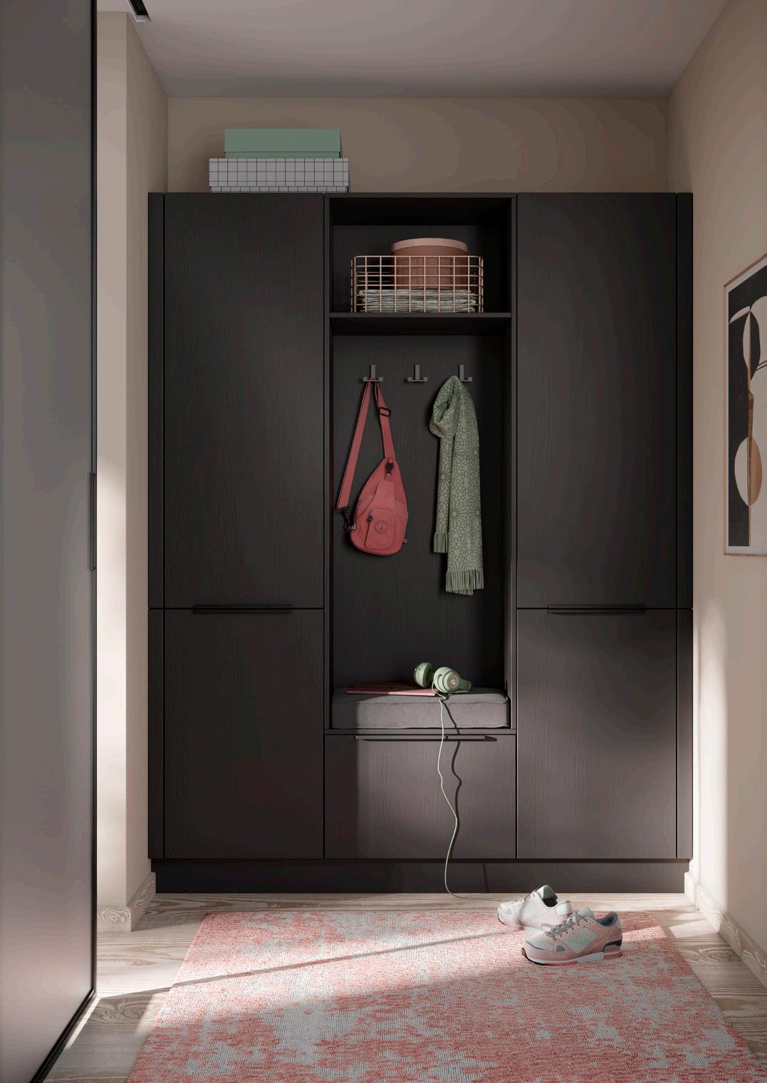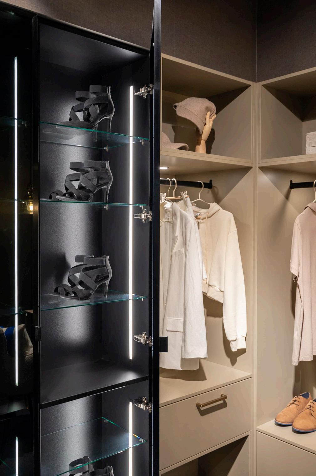 Warm colours like umber-natural are excellent for the colour scheme of the dressing room, best combined with expressive contrasting colours. Our insider tip: Black shelves. They make your clothes truly shine.