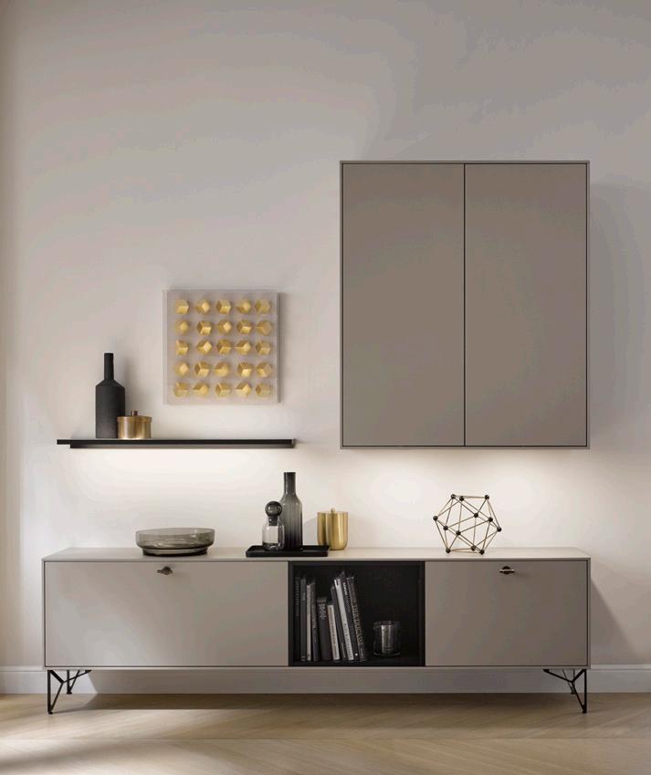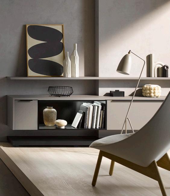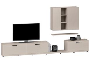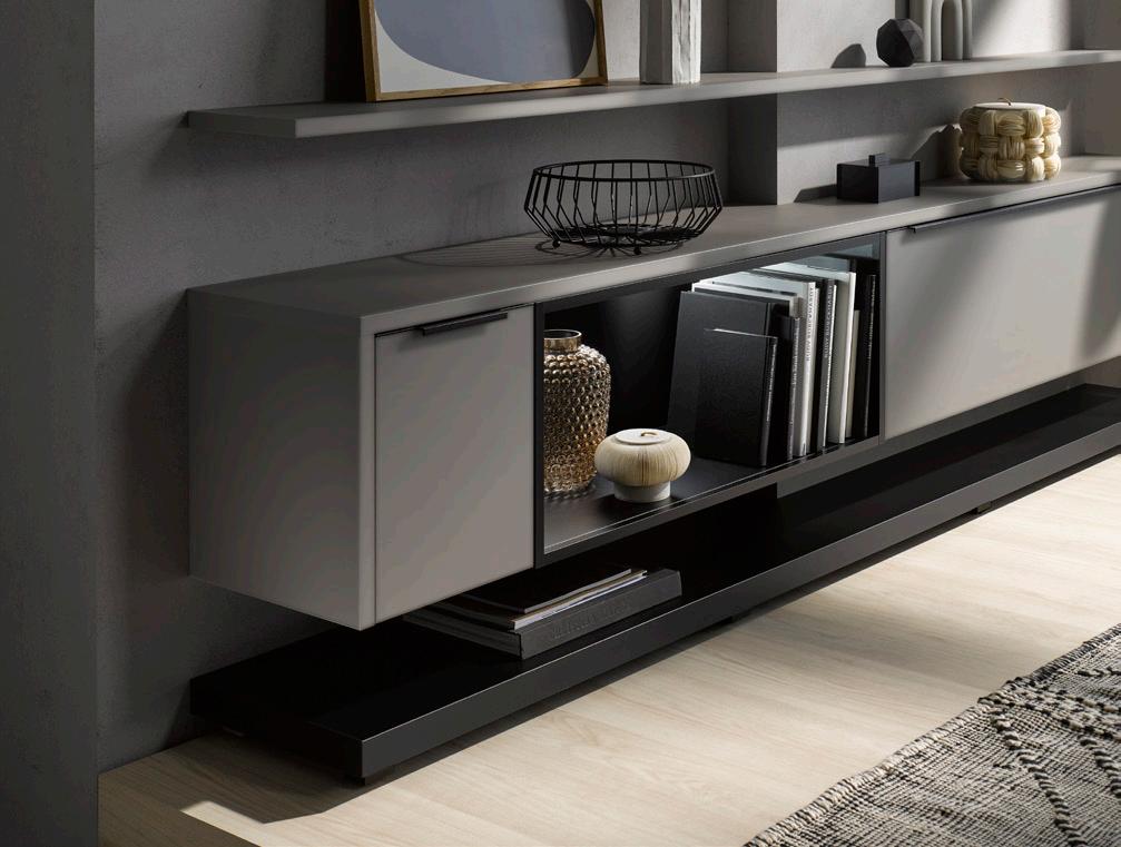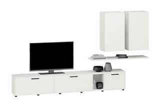 Los módulos bajos pueden combinarse a la perfección con estanterías, armarios y paneles traseros para crear un conjunto de pared de salon armónico. Debido a la uniformidad del color y del material, se crea un conjunto armonioso con un efecto de bienestar garantizado.