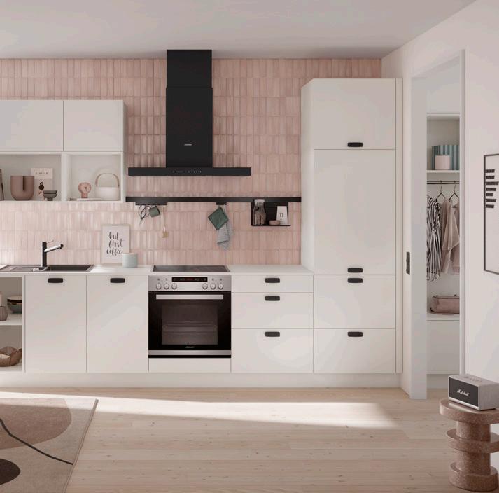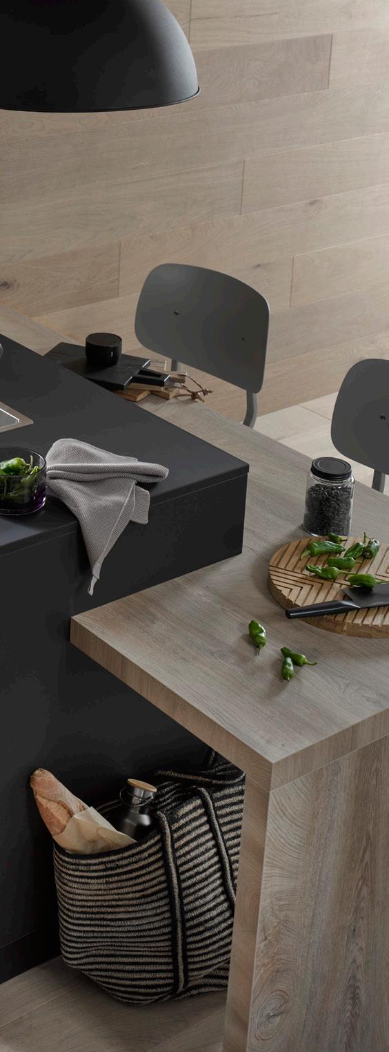WIJ DENKEN VERDER DAN DE KEUKEN! Open keukens vormen het uitnodigende centrum van het huis. Daarom is het des te belangrijker om een naadloze overgang naar de andere leefruimtes te creëren. Hoe u dat doet? Maak gebruik van kleuren en materialen uit de keuken. Zo krijgt uw huis een harmonieuze uitstraling - van de keuken tot de woonkamer tot zelfs de garderobe!
