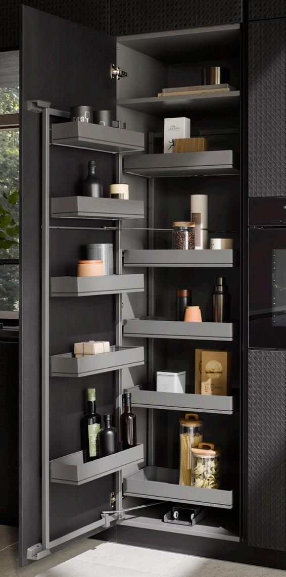 Muchas provisiones quedan olvidadas en los rincones menos accesibles de los armarios. ¡Esto no ocurre con nuestro sistema extraíble Tandem! Con un solo movimiento, todo el contenido del armario sale a la luz al mismo tiempo. Novedad absoluta: la exclusiva variante en un elegante y brillante Black Chrome.