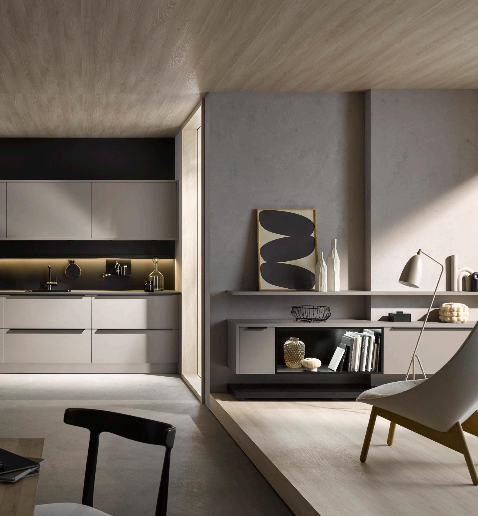 ¡NUESTRAS IDEAS VAN MÁS ALLÁ DE LA COCINA! Las cocinas abiertas son acogedoras y el punto central del hogar. Precisamente por eso, aún es más importante que la transición a las otras estancias sea fluida. ¿Pero cómo hacerlo? Recuperando los colores y los materiales de la cocina. De esta manera, todo el hogar presenta un mismo «look» a juego, ¡desde la cocina pasando por el salón hasta el guardarropa!