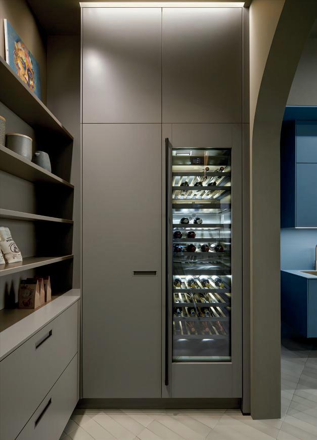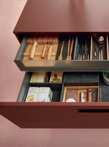 ZUM BEISPIEL GEORGIA, DIE AUCH ABSEITS IHRES JOBS IN DER STERNEGASTRONOMIE GERN EINE GUTE GASTGEBERIN IST. Spätestens, als diese monatelang schließen musste, stand für die vielfach ausgezeichnete Küchenchefin fest: Eine eigene Hausbar musste her. Etwas Repräsentatives, mit Fläche zum Lagern, Kühlen, Ausstellen und Vorbereiten; damit fiel das meiste wie eine Anrichte oder ein Barwagen mangels Platzangebot oder Flexibilität schon mal weg. Zumal sich die künftige Hausbar stilistisch in ihr Ambiente fügen sollte, das aus ausgewählten Space-Age- und Mid-CenturyStücken besteht. Fündig wurde Georgia bei next 125, wo für die Pocket-Elemente nun auch eine Bareinteilung vorgesehen ist – als Aufsatz auf Unterschränke – bestehend aus Frame-Nischenregalen mit Spiegelrückwand, Effektbeleuchtung, Wandsteckboard, Gläserhalterung, großzügigen Schüben sowie einem Kühlschrank für Weine und Champagner. Was Georgia mit den auffallend roten Haaren besonders gefällt: Die individuell gestaltbare Rückwand nebst Fronten wertet ihr Einrichtungskonzept auf. Dafür sorgt eine Vielzahl an Werkstoffen und Farbgebungen.