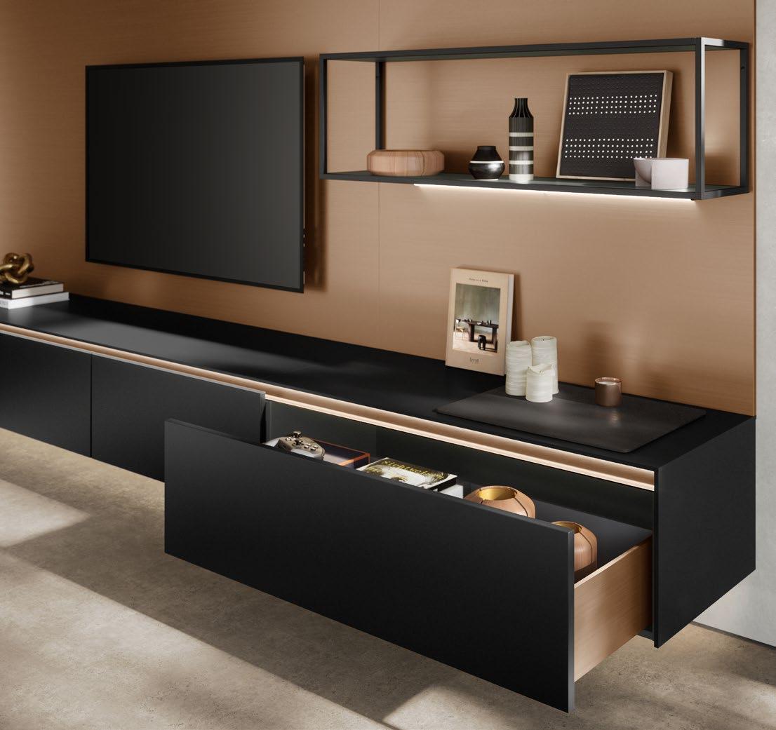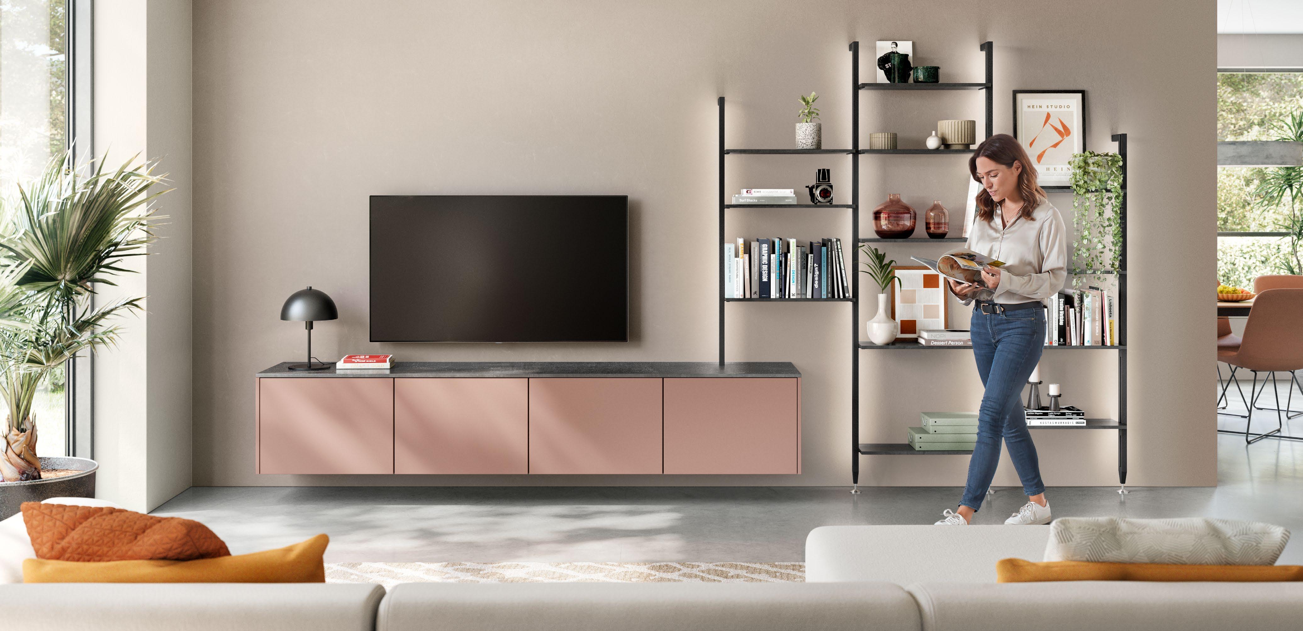 Make life more creative at home! Most wonderfully embodied by the elegant lowboard in the stylish coral colour, the aesthetic interplay between closed and open elements is sure to turn heads. Versatile and open to all things decorative, a spacious shelving system made from black steel boasts integrated lighting for extraordinary light effects.